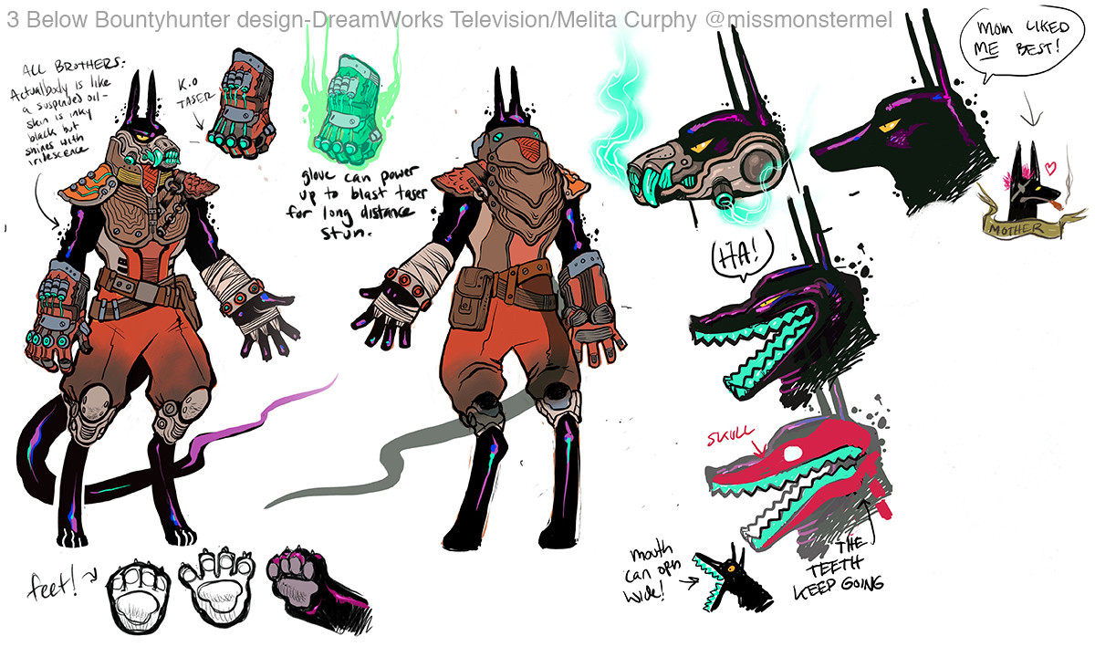 >>419766 That original design is far better than the final product, the oily black body that was planned just came out as amphibian-like skin. And everyone is decked out by TRON lights... y'd think bounty hunters would not want to stand out in a crowd and be stealthy. That said, the whole outfit and Anubis design makes me think this artist saw Birdy the Mighty and got the idea for Alpha there. Where did you find this btw? Got pics of the others designs? And why is the show even called 3Below? I guess there are 3 main characters but they are not ever underground.