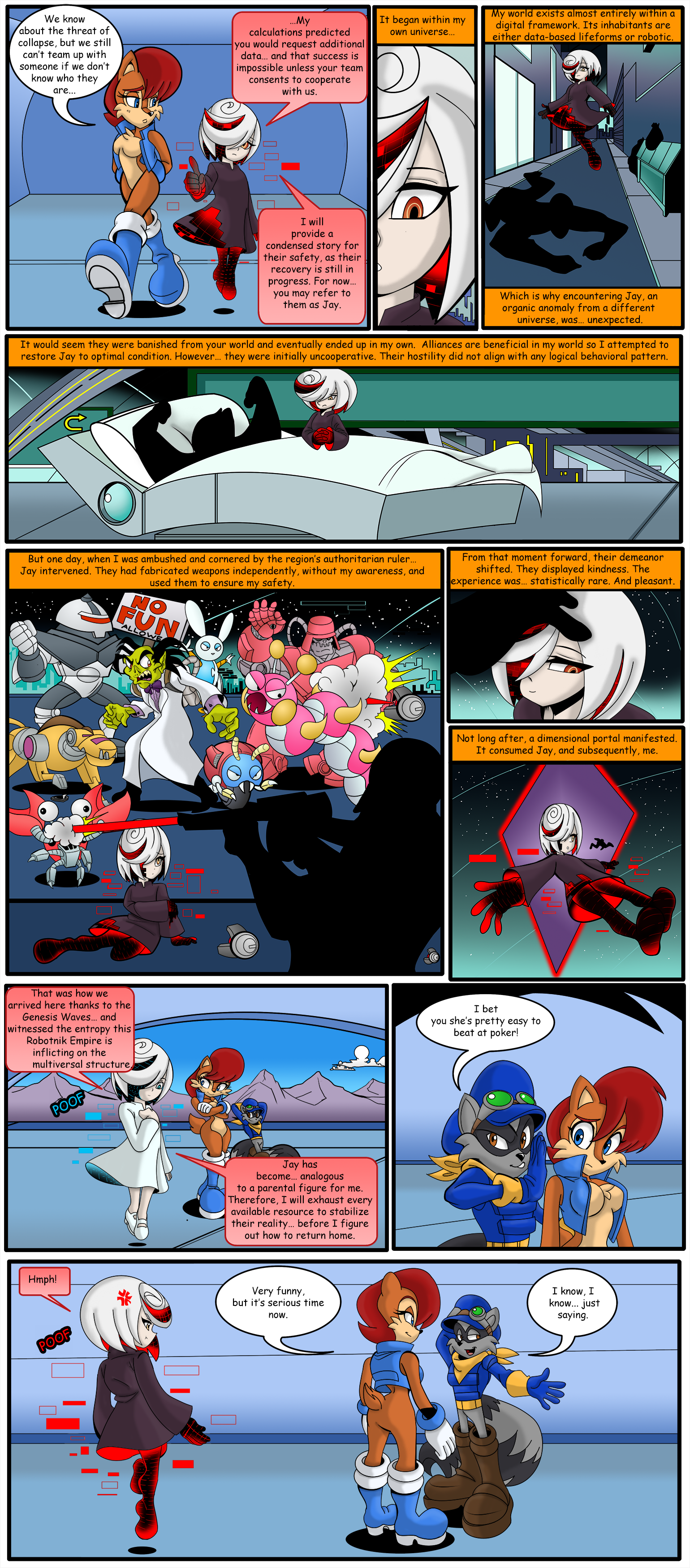 >>440278 Sorry about the large file size for some pages. I don't know why there's jpgs and pngs mixed so often in the same comic. PNGs are such a pain in the ass and balloon in size. >>440277 Endangered Species also doesn't seem to have happened. Not to mention Bunnie getting caught in the explosion with Antoine. I'd just say roll with it.