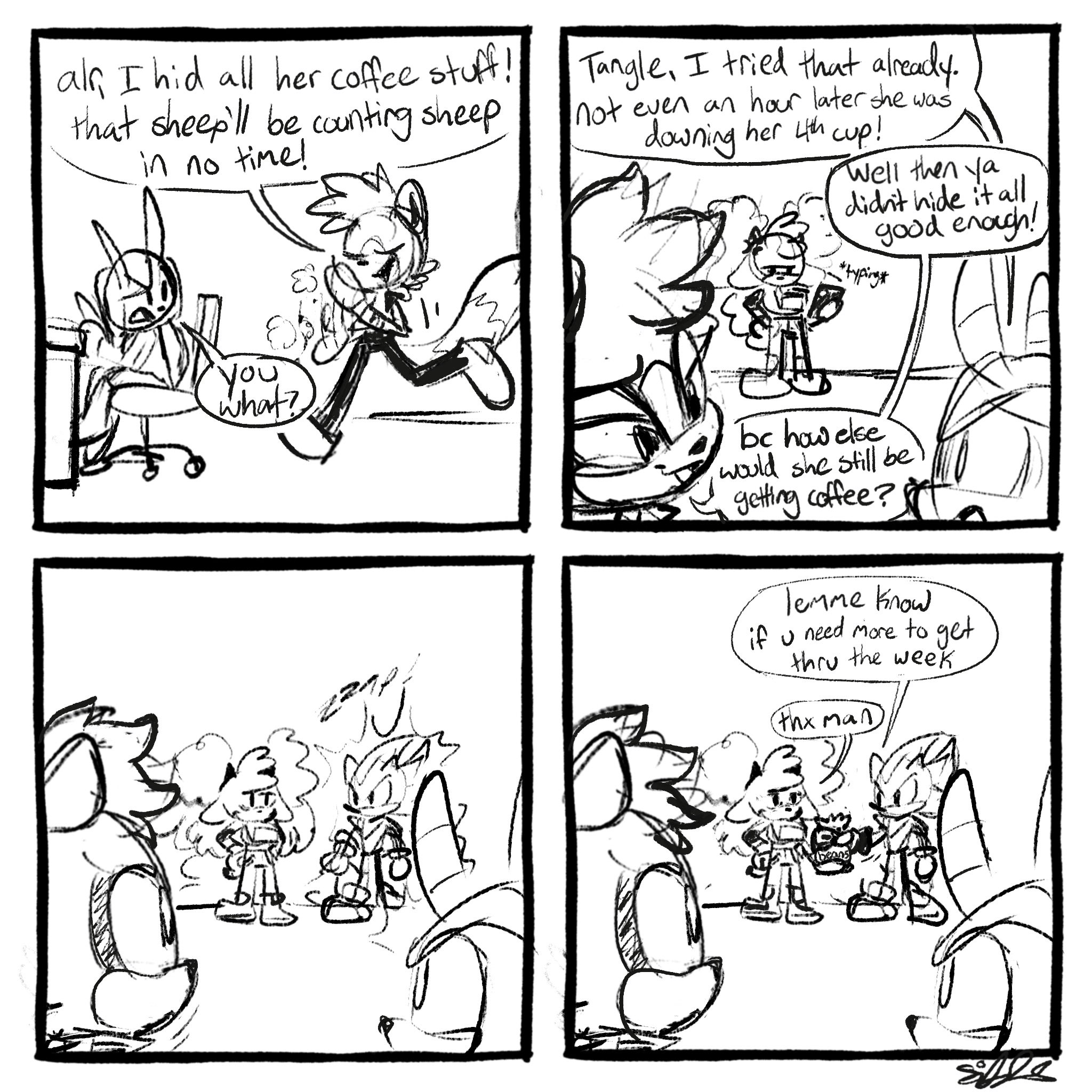 Also the comic by the twitter user @pocketscribbs, which inspired ABT's Hot Coffee. Although a bit too ooc for a canon work, I like how cute and autistic he writes Shadow.