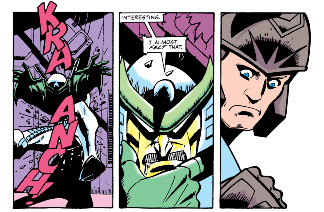 >>486419 Yeah, the suggestion is that Grimlock socked him in the jaw, then punched him in the midsection, sending him backward into the wall. Nice bit of compressed storytelling.