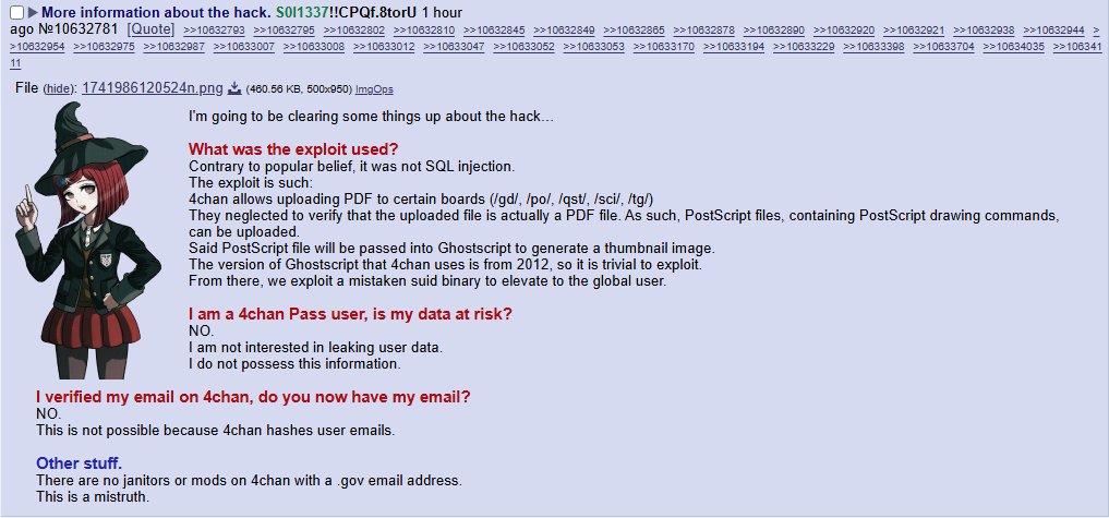 >>480850 >>480856 Realistically, what would 4chan even look like after the hack? Also, a week seems too short of a time to update serious security vulnerabilities. I hope they didnt just patch the single explot that killed them while keeping the other shit people hate... if the site controls worse than it was and if im still banned idk, might just stopnusing that site completely for one of these. Or maybe ill join the sharty to raid 4chan from within. I seriously hope they spent this week and a half actually doing something instead of having a massive janny oegy