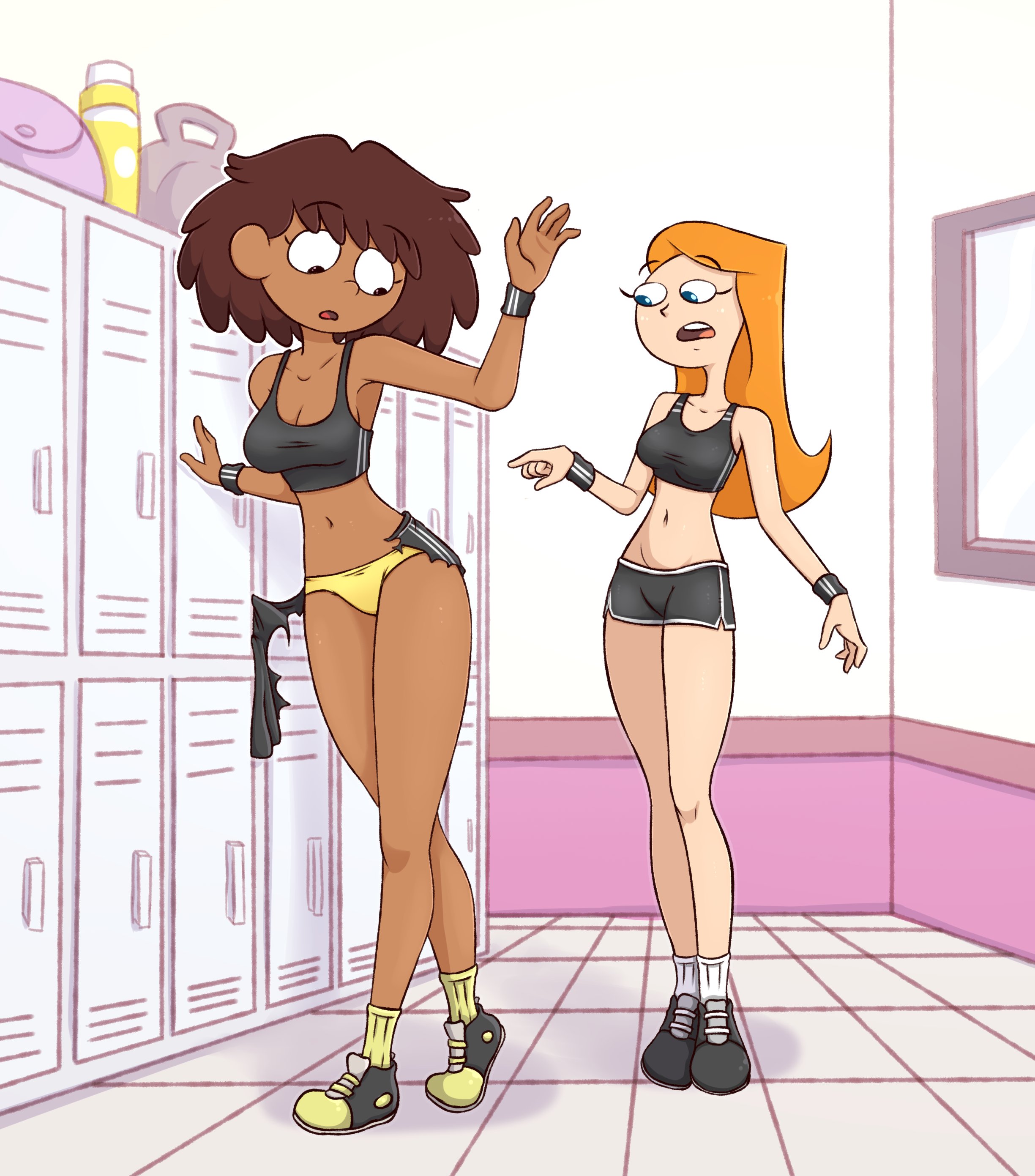 Requesting Marceline wearing A.K.I.'s outfit and Susan Strong wearing Marisa's outfit. (Skip the hair in both cases.) They're posing as if for a photoshoot, but Marcy is distracted, gawking bug-eyed and slack-jawed at Susan's cleavage.