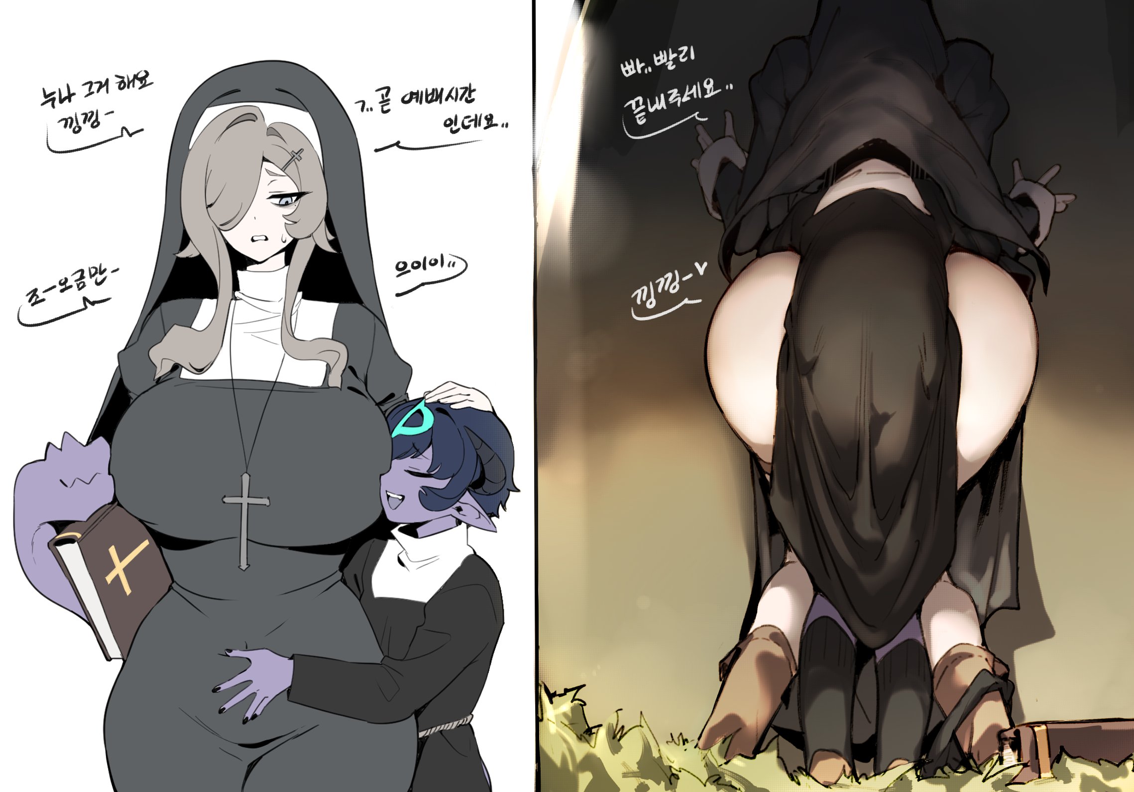 1. The nun inside a confessional booth cleaning it minding her own business with Spirou saying a bit of naughty stuff or something he has seen other nuns and priests doing at night in that same place like "You know I saw Father Teo and Sister Marie here last night, guess they did a bit of a mess in there, right?" as she blushes. With a sort of bubble showing Spirou with a boner or something that implies that asking. "Wanna do a mess too." or something along that line, I think you get the point of this.