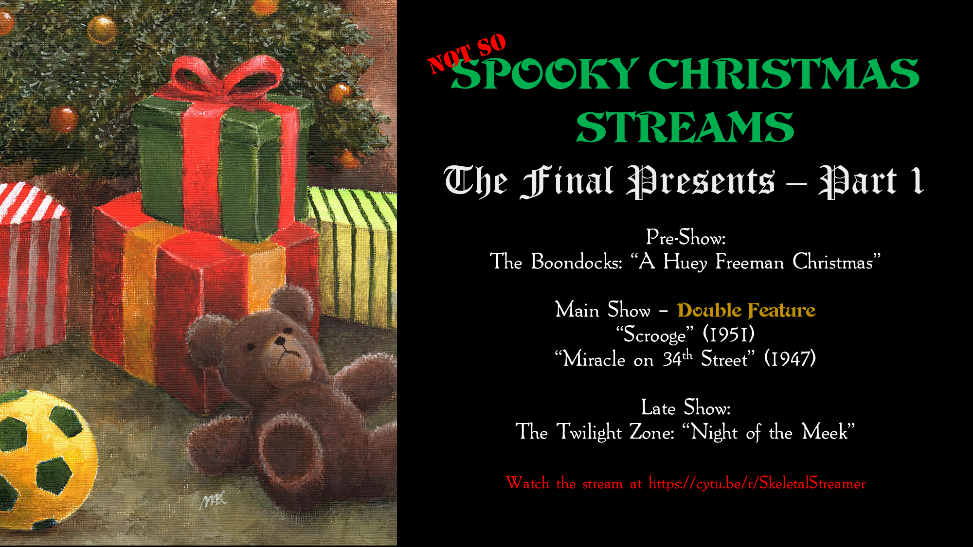 TODAY, ON CHRISTMAS DAY To begin the festivities for this, one of the greatest days of the year, we have a line up of true Christmas Classics. But first, we are to be awestruck by the artistic vision of Huey Freeman’s Christmas pageant. Next, what many consider to be the definitive adaptation of Dickens’ classic, Alastair Sim as SCROOGE. Next, the appearance of a man who claims to be the real Santa Claus within a New York department store brings a wave of newfound Christmas Cheer to the public, even in the face of adversity, in MIRACLE ON 34th STREET! Finally, before our final stream of the season, we must step into the Twilight Zone, to see a tale of giving like no other.