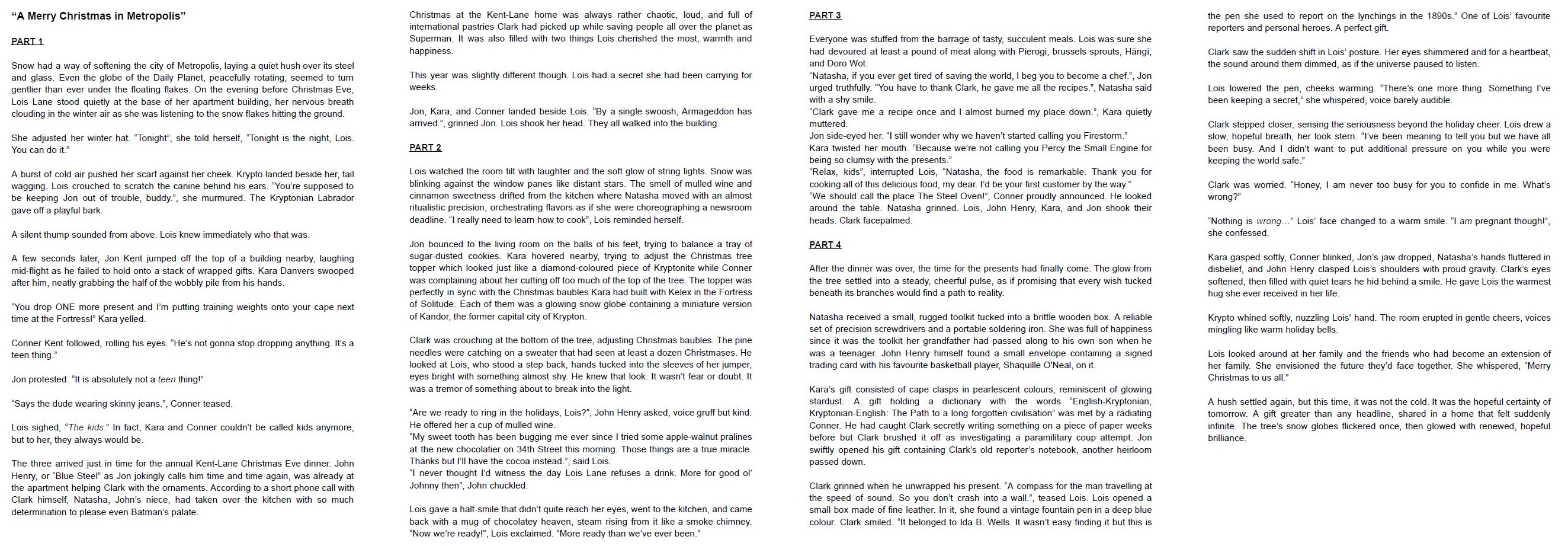 1. Seasonal (winter or holiday) setting AND 2. Any or all Jack Kirby characters 3. Any member of the Super Family (including any version used in an Elseworld or Alternate universe whose directly connected to a Super Family member) 4. really creative or imaginative /co related world building of your own or 5. really creative or imaginative use of /co related canon characters/universe as your setting or as your subject matter