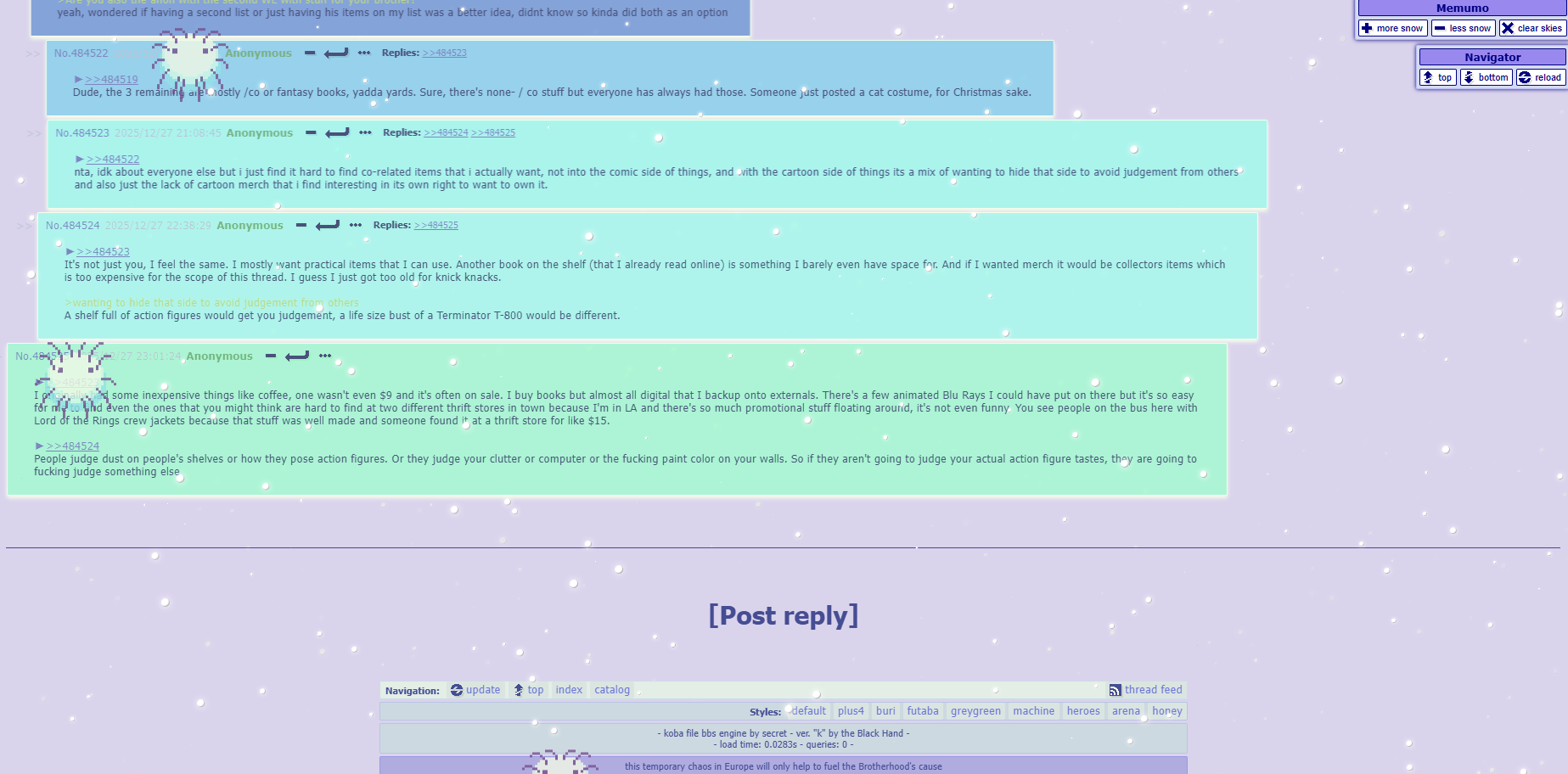 After The Great 2024 Disaster, /co/ Prime Secret Santa was deemed "against the rules" by the mods. And so, plus4chan will remain where all the wishlists and updates to the pastebin will be posted for this season's Holiday Cheer Thread.