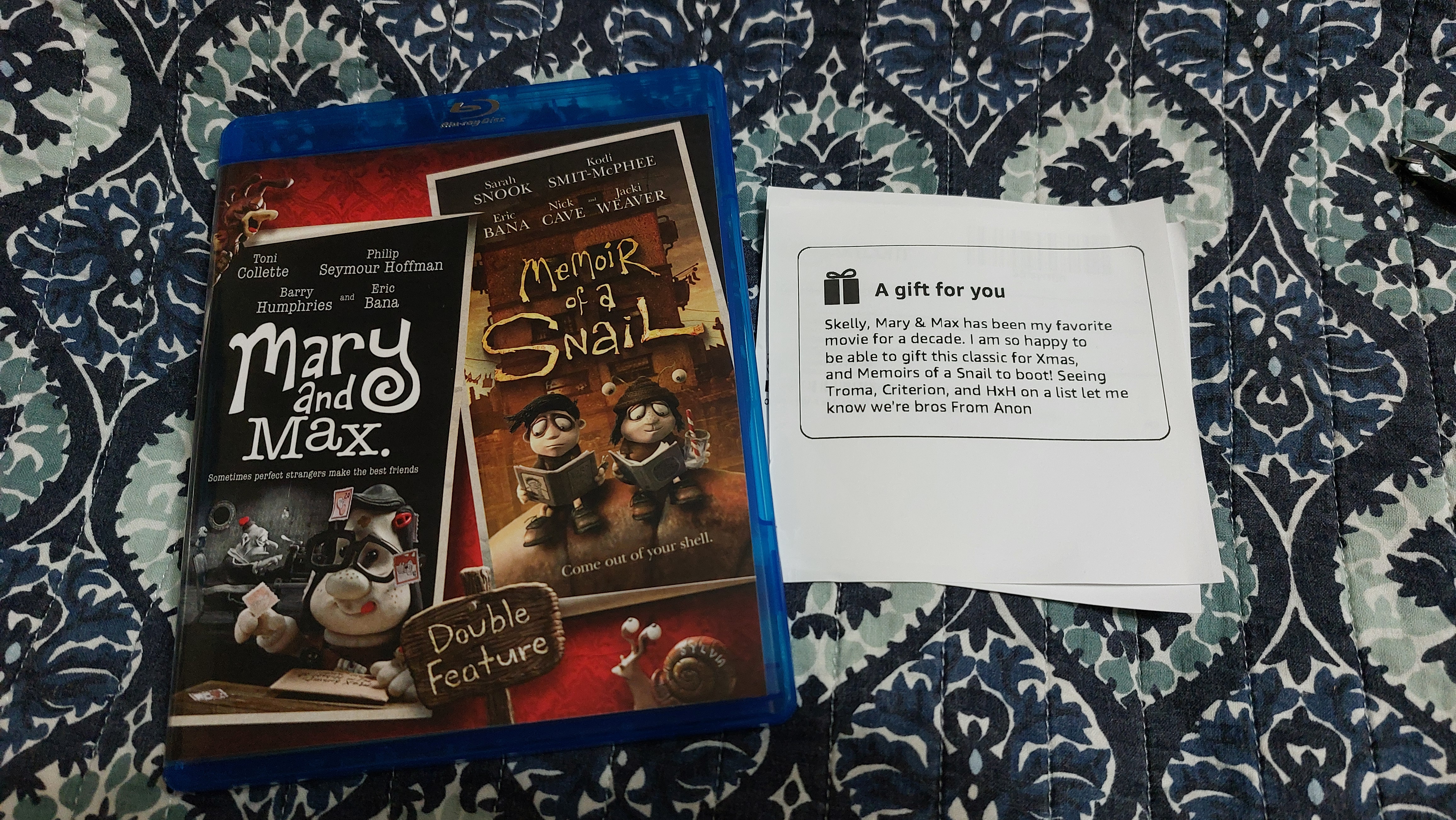 Just got my gift delivered! Thank you, anon, I had always heard of Mary and Max, but I have never seen it. After seeing the praise for Memoir of a Snail, I was pleased to see they were in a combo. I'm sure I will love both.