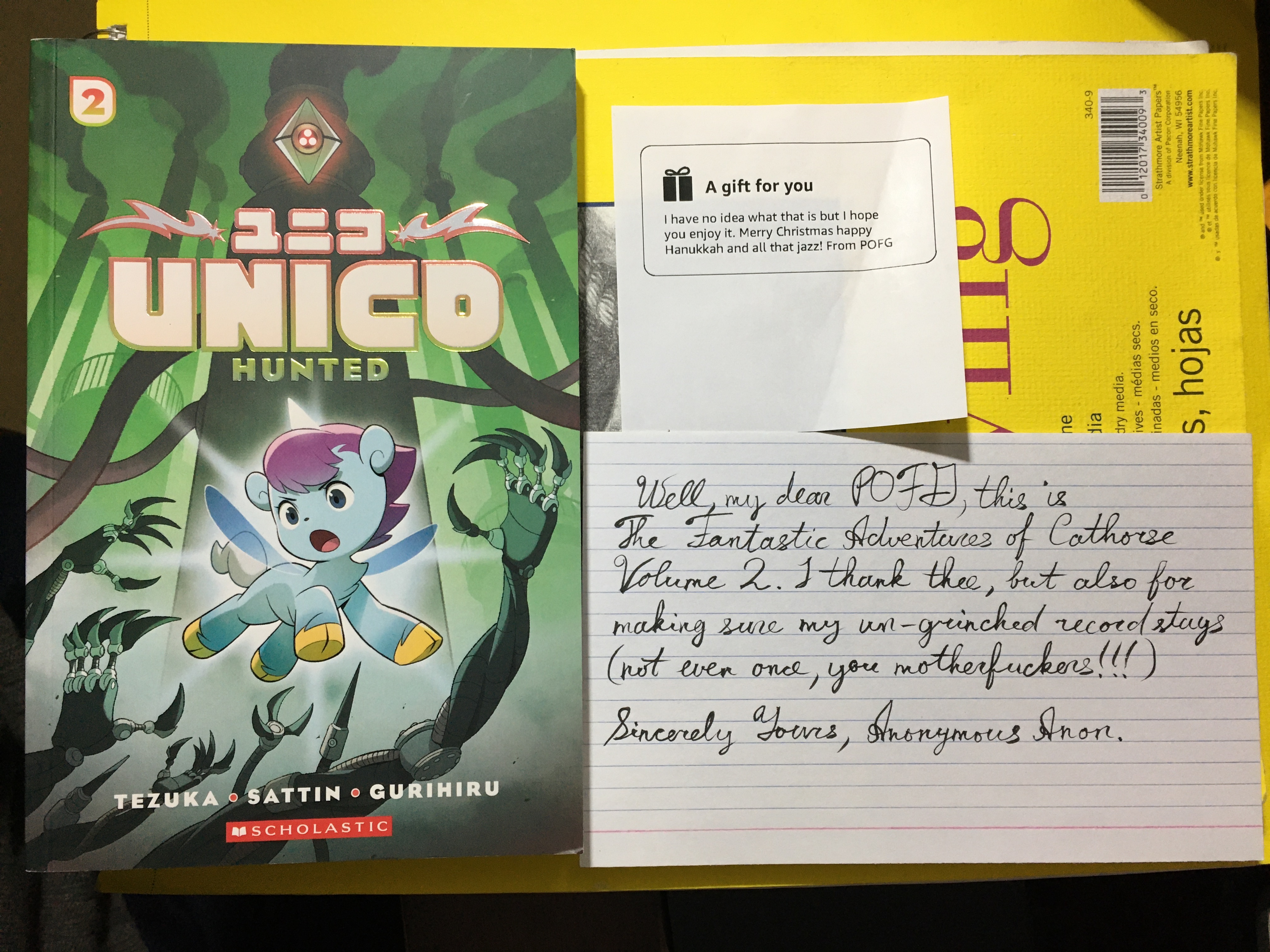 Anyone previously gifted who has not yet posted pictures or at least posted their items were received, please do so, folks are asking about it at 4chan Prime.