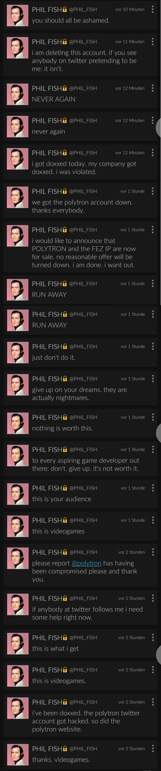 Phil Fish got doxxed, and is apparently selling the Polytron and Fez IP. Ostensibly the doxxing was in retaliation for whatever he did in this whole ZQ debacle.