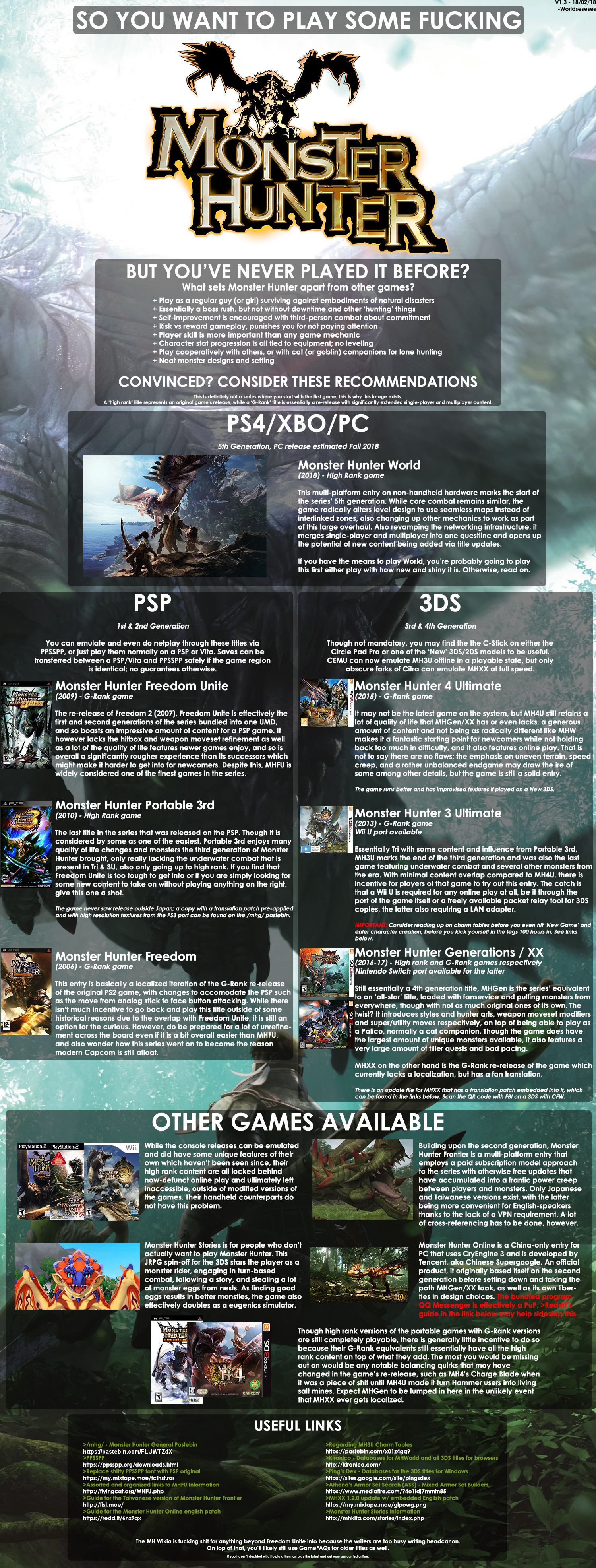 >>424036 World and Rise are the newest ones and are the easiest to get into, so consider those. If you can deal with jank and some harsh difficulty spikes, then check out one of the early ones. Check out pic related for a more detailed guide despite it being a little outdated. The best ones are the G rank games since those have the most content.