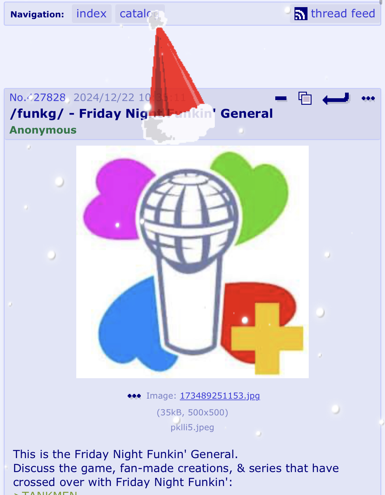 This is the Friday Night Funkin' General. Discuss the game, fan-made creations, & series that have crossed over with Friday Night Funkin': >TANKMEN >Pico >Madness >Spooky Month >& More
