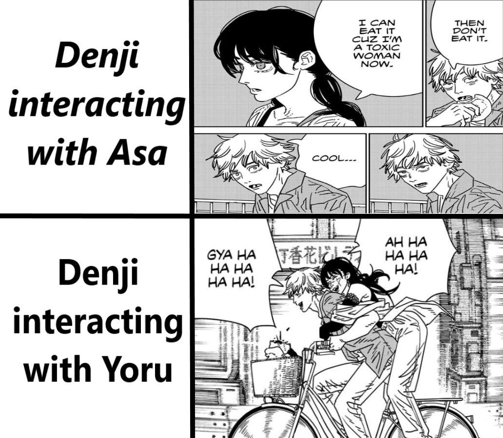 >>420785 Yoru switched because she could, because Asa let her guard down, and because Yoru wanted to have her style of fun with Denji. What Yoru finds fun is what Denji does as well. Meanwhile Asa does not click with these people. Both Denji and Yoru find Asa boring and that's just how it is. Denji could not have been more bored and disinterested with Asa this chapter, meanwhile he was enjoying his balls off with Yoru.