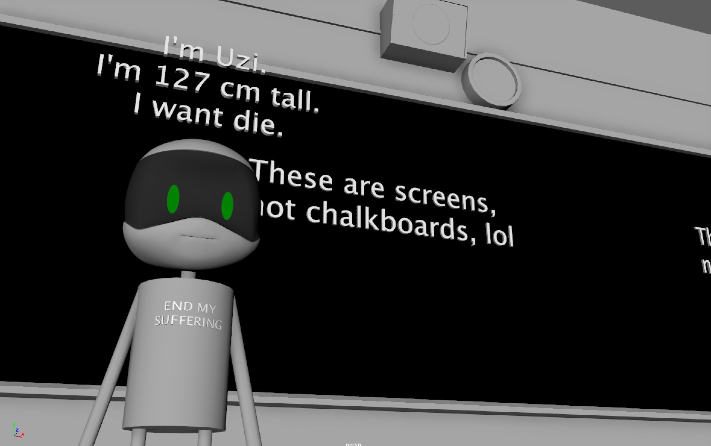 >>168130 >Yeah N keeps getting on me for not cleaning my room >Sometimes my chassis leaks this weird goo, I don't know what it is, and I just wipe it off on the wall >There's a colony of roachbots under my bed, they eat my leftovers