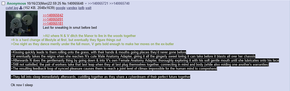 >>275357 Eschewed a list in favor of picking a single highlight It's short (and smut), but I'm still quite proud of this green. It hits a beautiful balance between wholesome & lewd that I honestly don't think I've quite managed to successfully replicate since. Not to mention how proud I am over "Anatomy Adapter" inadvertently ending up as part of the thread vocabulary