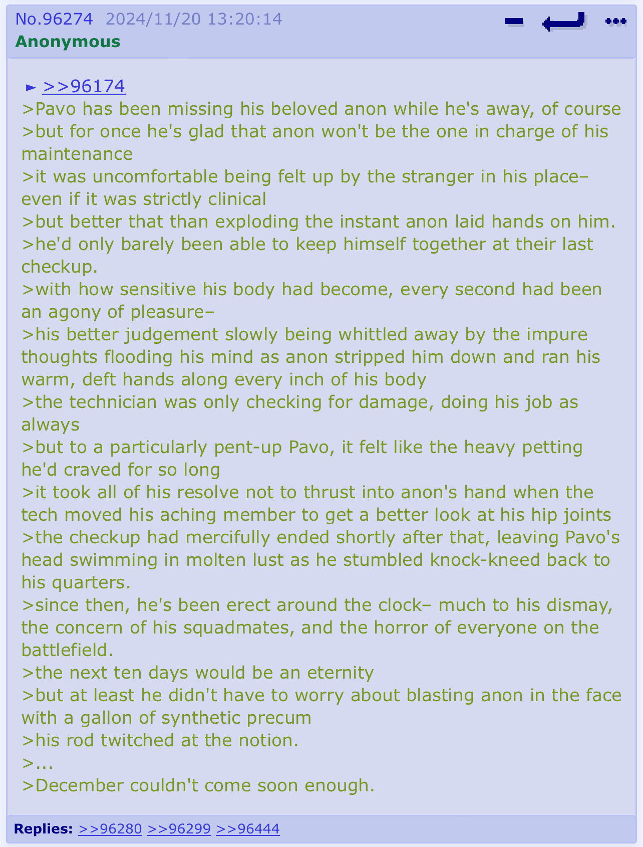 reposting since I posted it late into the last thread >less than a week out from the end of the month, and Pavo has abandoned any notion that he might be able to hide the toll NNN is taking on him >with each day– each hour– his perpetual erection only throbs more fervently >every attempt he's made to restrain it– make it even the slightest bit less obvious– has utterly failed. >his already tight pants tighter than ever, it's a small mercy that his fly hasn't given out yet >but even this last line of defense bulges worryingly against each furious pulse– >a gate straining against the incessant pounding of the great one-eyed serpent it struggles to contain >with each of the drone's steps its head brushes against the taut fabric, making the simple act of walking a near overstimulating affair >needless to say, everyone in the base is acutely aware of how their favorite feathered fag is faring in his losing battle with NNN >(as well as just how big of a cannon he's packing.) >extroverted as he is, Pavo would usually relish in the attention, and he never paid much mind to a few strange looks. >but even an incorrigible flirt has his limits– and more importantly, shame. >shame that painted itself in cool blue light across his blushing display– blue as the scenes that forced their way into his thoughts and danced about his brain. >naturally his thoughts were still of anon, but romance only lingered on the outskirts. >until he finally had some relief, he would be tormented solely by steamy daydreams of his beloved technician >of his true love pressing him against the wall in a passionate kiss, tearing away his suit to plant a trail of pecking kisses across his molded collarbone as a hand played with his feathers >raising his long, porcelain-white legs to rest over his shoulders and taking firm hold of the shapely derriere of which he was so proud >pulling away the curve-hugging pants to– >more well-earned stares. >Pavo's display was more blue than black now. it was a little too easy to get lost in thought lately. >despite how lust-hazed his mind had become, he still can't help but register the overwhelming embarrassment of it all. >the knowing, empathetic glances given by a few of the male SDs don't help any. >at least he could still count on missions for some form of stress relief.