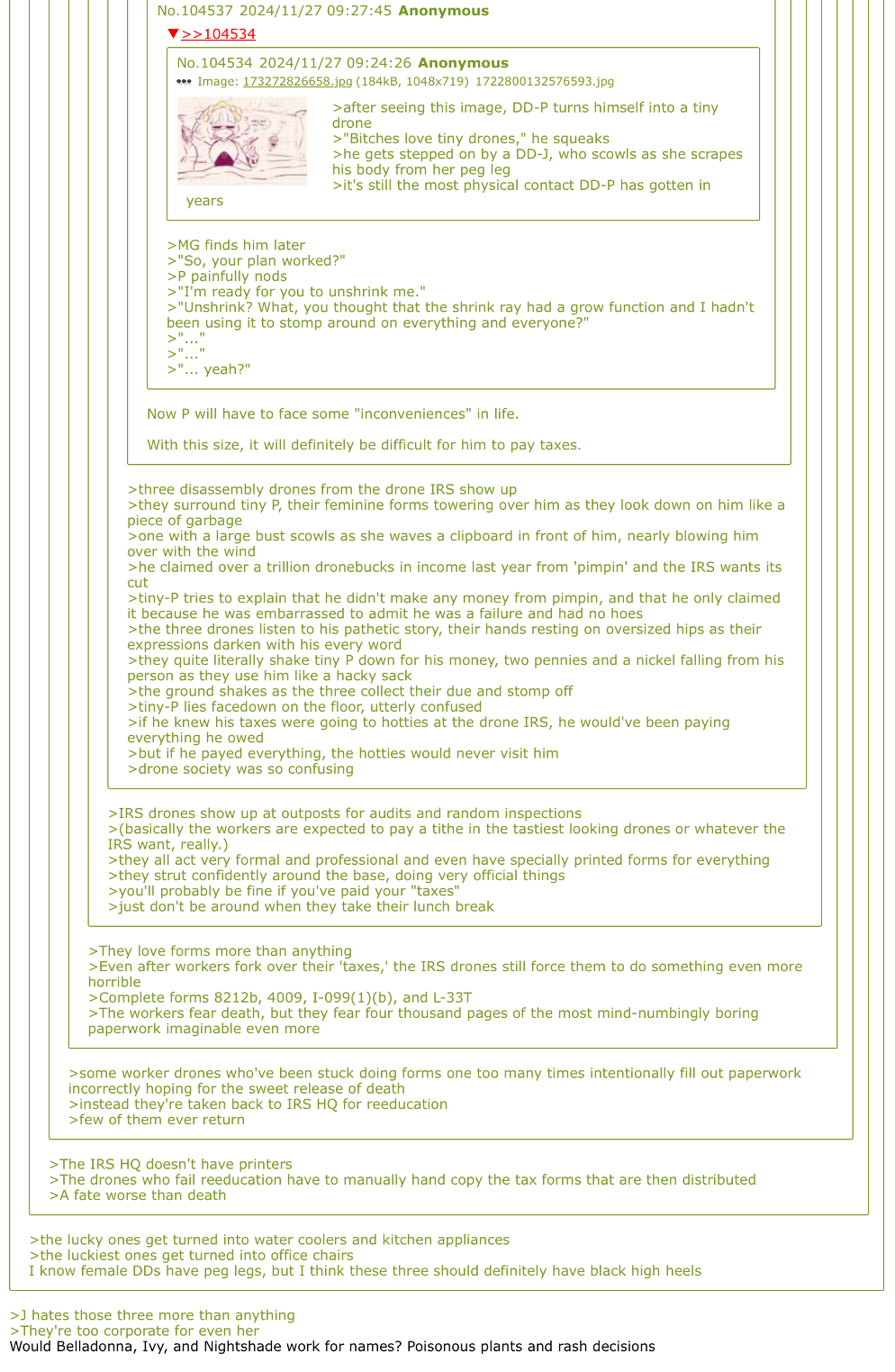 >>104539 >three disassembly drones from the drone IRS show up >they surround tiny P, their feminine forms towering over him as they look down on him like a piece of garbage >one with a large bust scowls as she waves a clipboard in front of him, nearly blowing him over with the wind >he claimed over a trillion dronebucks in income last year from 'pimpin' and the IRS wants its cut >tiny-P tries to explain that he didn't make any money from pimpin, and that he only claimed it because he was embarrassed to admit he was a failure and had no hoes >the three drones listen to his pathetic story, their hands resting on oversized hips as their expressions darken with his every word >they quite literally shake tiny P down for his money, two pennies and a nickel falling from his person as they use him like a hacky sack >the ground shakes as the three collect their due and stomp off >tiny-P lies facedown on the floor, utterly confused >if he knew his taxes were going to hotties at the drone IRS, he would've been paying everything he owed >but if he payed everything, the hotties would never visit him >drone society was so confusing