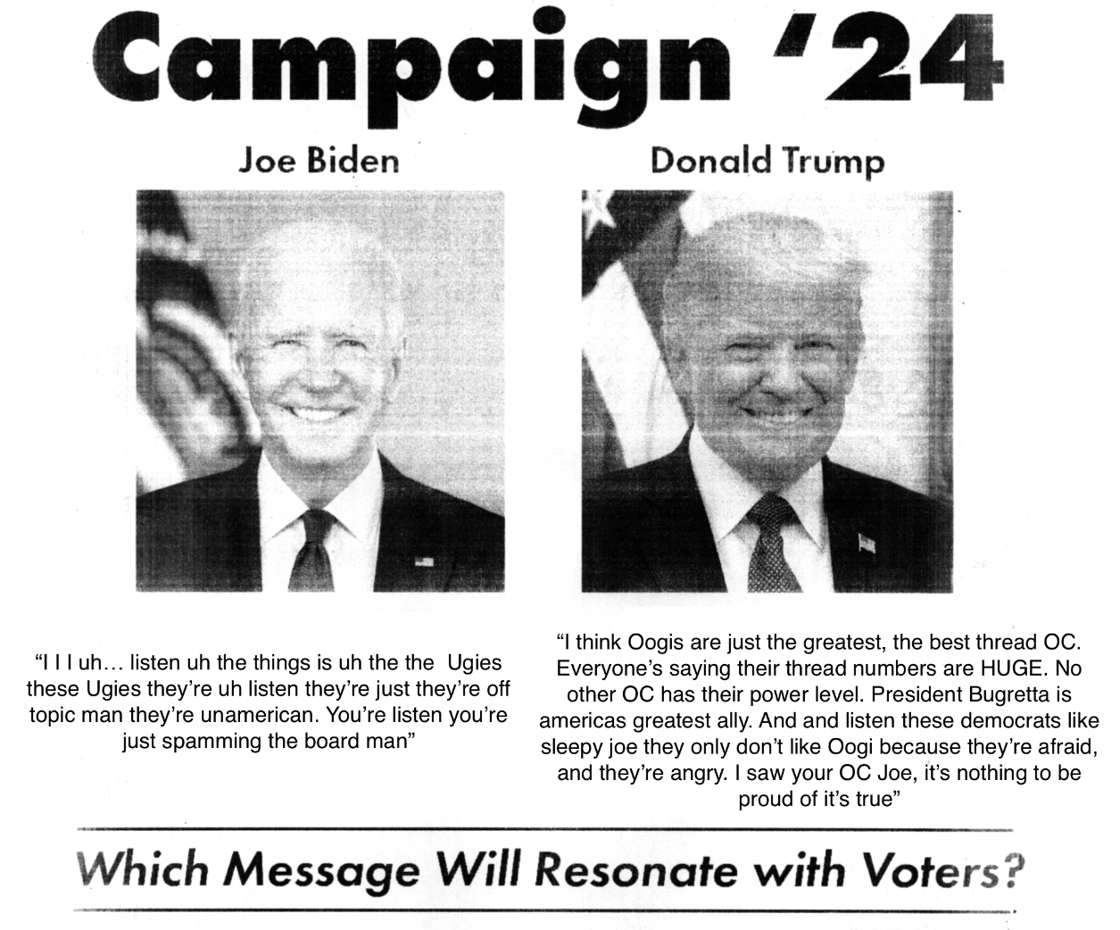 >>10702 >The Enns do a mass exodus to the nearest Oogi mart >many perish in the way, some taken by birds others Ennapped, most taken by Oogi >They do someone make it to the door of the Oogi mart and enter a dozen strong >The cashier who is dressed as an Enn so the Oogis don’t get too anxious see the little guys and is wildly confused >”Hello Friend Humie! Can Enn have Boogi please?” >”Enn know Boogi cost many nummies, here is all Enn has gathered fo trade” >They present to the bewildered cashier two dollars, a nickel, a wad of gum stuck to an Enns head, that same Enn, and a paper clip >Bugrettas go for 25 dollars USD