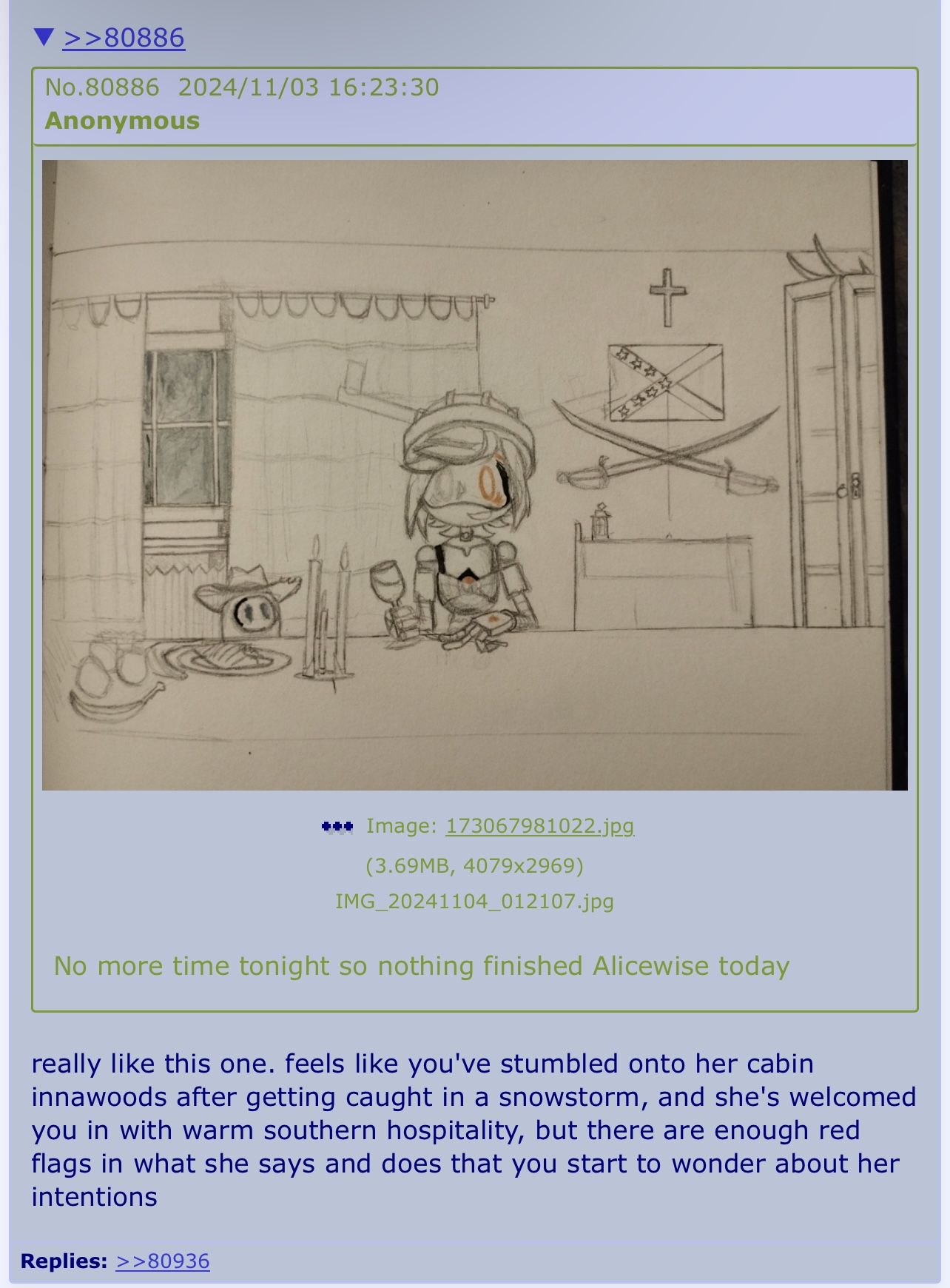 >>124215 Oh, very glad to see you are still on it! I think Alice would not have malice in her motivations, her kindness should be real, but please do not hold back on spookiness or unhingedness, i'd love some ulterior motives too. Think of it as her not seeing anything wrong in what she's doing, her social ineptness due to isolation could 'explain' it maybe >>124216 Basically what this says >>124222 If ulterior motives are this then please please do that if you feel alright with writing that we didn't get such scenes with Alice since 11 months ago. But just go with what feels right, I will wait looking forward!