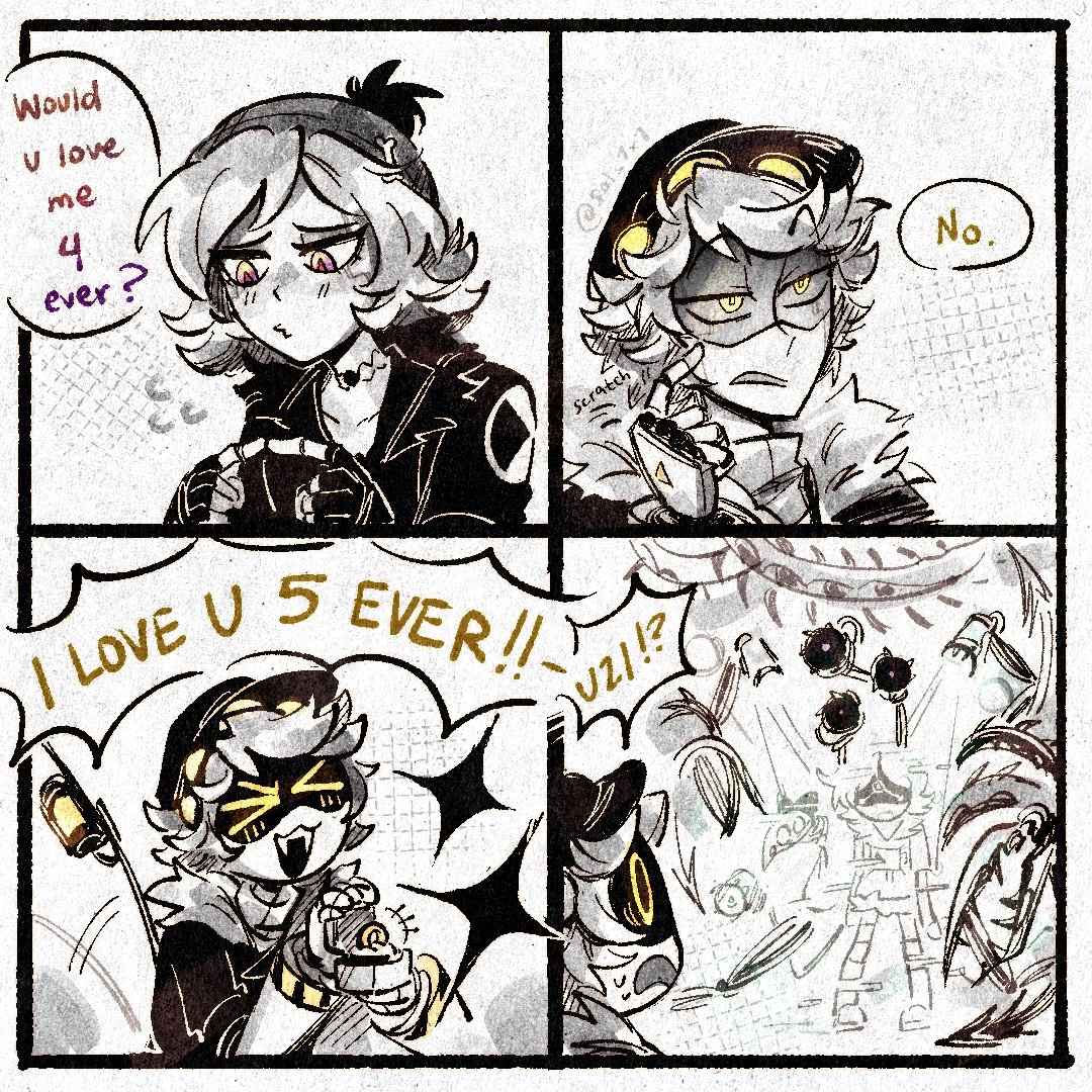 Then there is of courser the rougher later treatment, namely >Back to the others!😾 And >They can't leave the office IDJIT ! but those can be explained too, if it's justified depends on you. The first one was due to Beau idling there without a thought evident on his 0\/0, I think Alice told him to get out there becuase he was in the way, would not like what was going to happen soon anyways, and maybe because Alice was somewhat mad at herself still due to letting herself get caught by Uzi like that earlier, maybe something along the lines of 'shouldn't have expected anything else from Nori's spawn' or so. The second 'outburst' has a better explanation, realizing that Beau let the DD see the code, the very same DD that tried shoot the pillbaby on sight earlier, the very one that could have entered Alice's room and killed them both there (the door was still open at the time (green light)), Beau did fuck up there. Alice's response was rough, but I think upon realizing what happened there wasn't just anger bit also surprise and maybe some fear as well. Seeing Beau stand there 0/\0 doing nothing again didn't help him exactly.