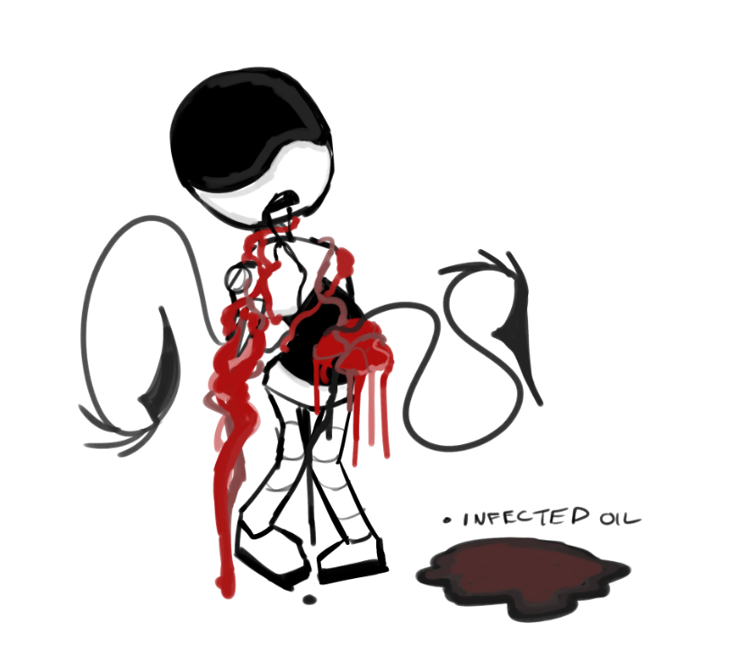 >What if the oil of the solver hosts was infected >this oil has meat/organic components made by the solver >it can be touched, manipulated and transported but it is advised you shouldn't expose yourself to the infected oil >if this oil is consumed by non-solver hosts this could bring greater consecuences >it brings infection to the insides of the non-host drones, fleshy parts start to build up inside of the drone >this infection is prolonged for hours/days until the infected becomes a mass of a mix of oil and flesh, killing the drone >solver hosts are inmune to this infection >zombie drones have some sort of inmunity, they present the flesh symptoms, but they are not killed and have a portion of control of these fleshy bits