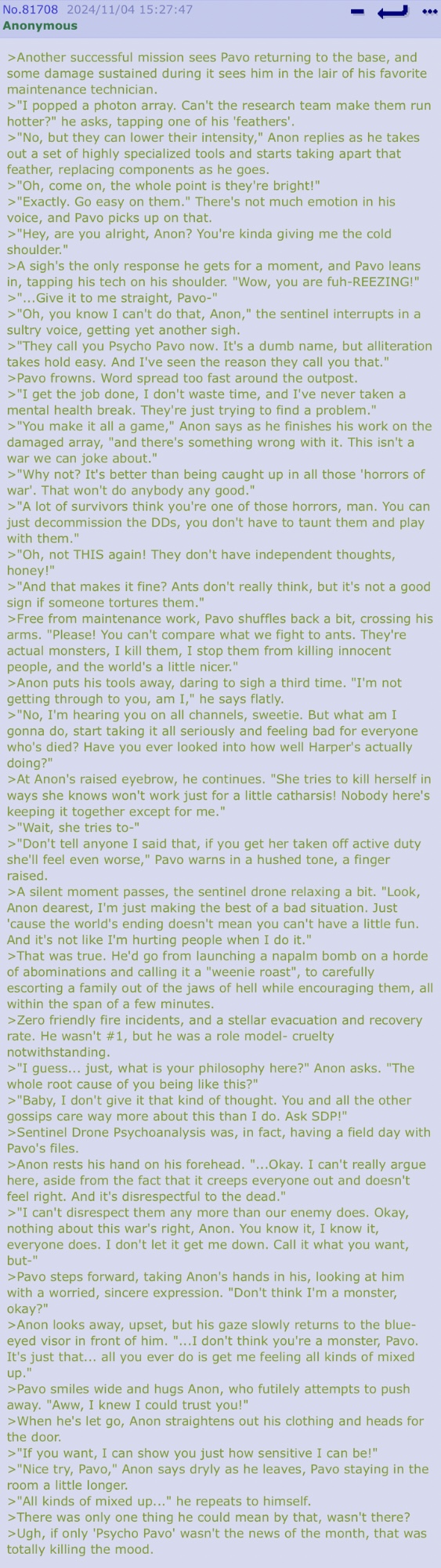 >Bonnie wakes up to the sound of beeping and dulled pain >The too-bright blurs resolve into a hospital ward... an actual hospital, not a jury-rigged field tent running on a half-dead generator >In front of her is a drone, too tall to be a worker >Blue hair, kind eyes, the general figure of a murder drone, yet the calm and soft smile of a comrade, clad in a fine dress uniform belonging to no Earth military she recognizes >"Officer Miller... it almost cost us everything, but we won." >Her Miller luck at it again... >She makes a long, drawn-out groan before drifting back to unconsciousness >The poor girl needed the rest, whatever she'd been through. >And a year's worth of baths, Pavo's seen roadkill in better condition than her.
