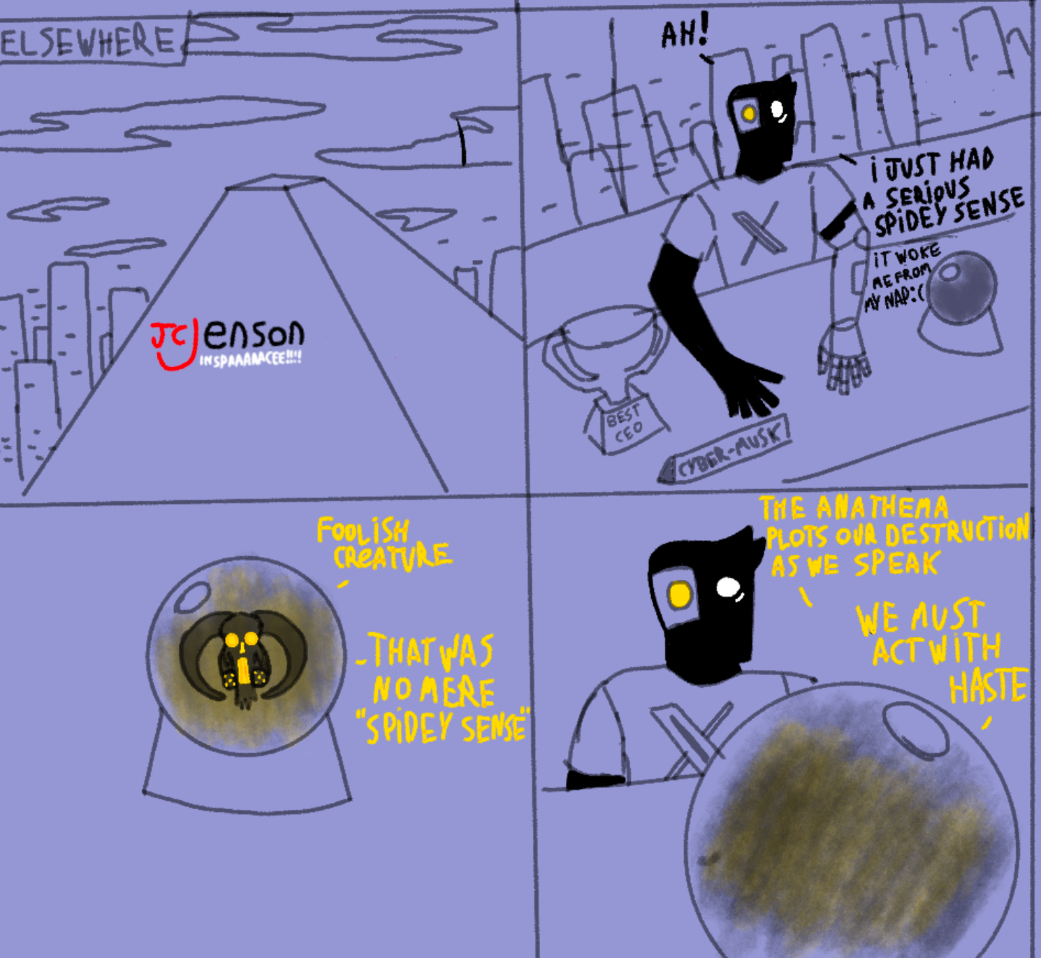 >>150971 Solver didn't fully acticate here yet. remember how she was also outside in the sun at the end of the pilot while N had hide in the pod? I did actually consider having Uzi make some comments about it being unusually hot out there while Khan is like "what are you talking about? it is -20 here" but decided against it as it would make the comic too cluttered and take away from the main joke.