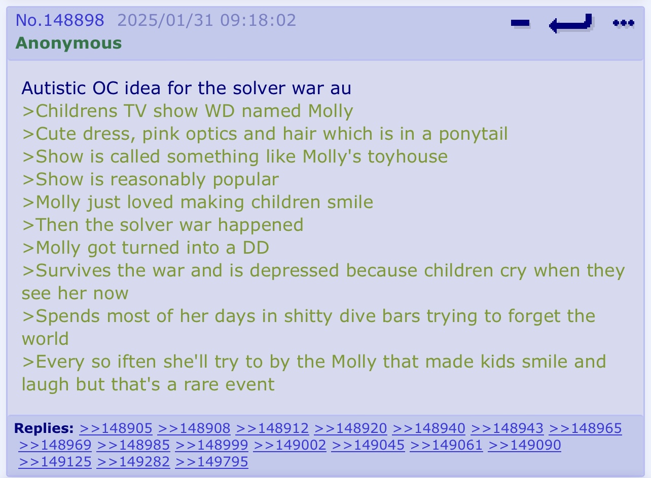 >The news media is seeking to do another hit piece on Molly. >However instead targeting the former entertainer, they targeted her 3 friends and found out a lot and starts trying to dig up dirt. >Pavo was a Sentinel Drone vet that was kinda known for his dislike of Disassembly Drones. Constantly bombarded with questions why the likes of Molly and DDanni is fine with him to he around with and constantly brings up Molly reputation as a child killer during the war. >DDanni (or rather Delta) had been known by vets and other DD’s alike to be a cruel and sadistic bitch responsible for traumazing a lot of soldiers. DDanni gets hit with “is the reason why you are friends with her is because she’s a monster like you? >And of course there’s Buddy, the only human vet of the group and is often asked on how he feels about sharing a roof with a war criminal and a child killer. The moment they figure out that buddy was on Molly’s show and was that kid that confessed his feelings to molly, They would start driving pressure by asking questions related to that moment.