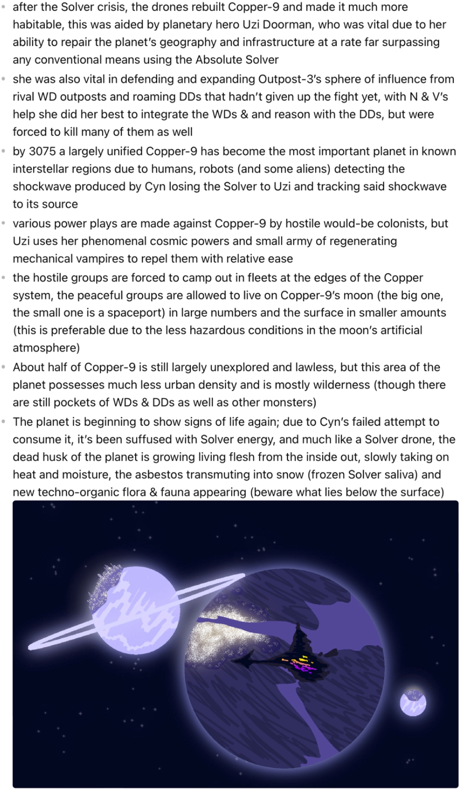 >>152131 Retarded offshoot of threadlore and MD lore knit into a consistent world and story with a wiki of sorts backing it. I got the sparse beginnings of a timeline planned out, plus some militaries, companies and some organizations but never got further than a few things due to procrastination and depression, though I still want to try messing with it in the future.