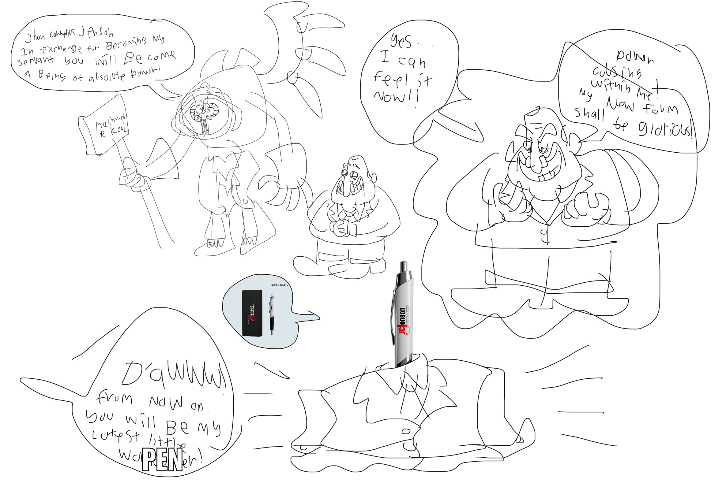 >>151985 >John Cornelius Jenson makes a deal with the Absolute Solver; Granting the Solver access to our world in exchange for becoming a being of absolute power >The deal is struck and he gets transformed into an indestructible and all-powerful branded pen