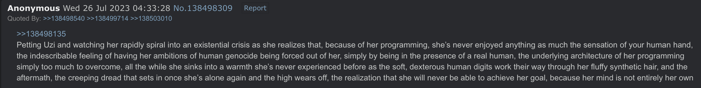 >Those men weren't just soldiers, they were ruthless killers who wanted payback for their fallen comrades and especially all the time they spent looking for the drones. They were absolutely willing to do unspeakable things to her, certainly to V and... if N was in their hands too, Uzi didn't want to even imagine. Sadly she would find out soon enough.