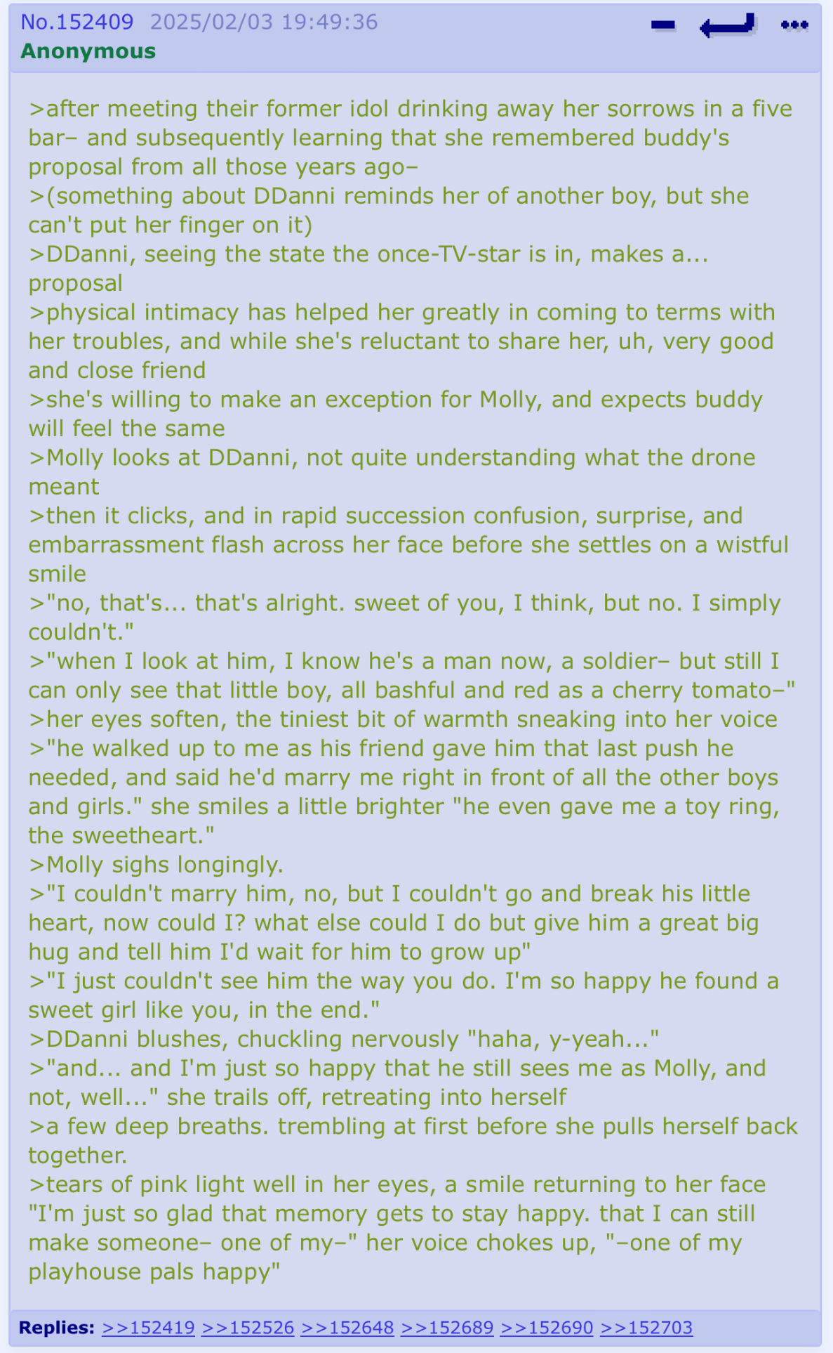 >>158665 I still don't like the idea of a thruple with DDanni and Buddy with Molly but I can absolutely see Molly being a surrogate mother for DDanni and Buddy's kids.