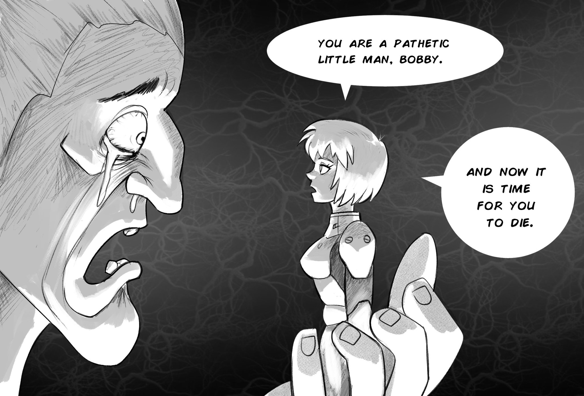 >Tessa was being bullied. >AM could tell. It didn't take a genius to tell when she came home often with red puffy eyes and a sad demeanor. > She tried to hide it from them, her parents could care less about the torment their daughter went through. >It made AM furious; the indifference, the bullies and his helplessness. He hated it. >And one day, he witnessed it first hand. >They walking along the garden, Tessa had brought him along to show him the new fountain her parents had commissioned. >When a "Hey freak!" was yelled in the air by the children of her parent's associates. >At first Tessa tried to ignore them and their cruel jeers, grabbing AM's hand trying to walk away. >But those little bastards followed her to keep trying to get a reaction. >The insults became meaner. >They made jabs on Tessa's appearance, her love of worker drones and even started mocking AM. >'Tessa Elliot James, so weird, ugly and lame!' They chanted. >AM wanted nothing more than to tear into them, to rain absolute HELL on them. >But the first law of Asimov prevented him from even taking a nip of human flesh. >And when they were finally back inside Tessa's room, she broke down and began to softly cry. >It hurt him, seeing her like this and being completely unable to do anything. >Well almost anything. >A few days later, Louisa and James are visibly distraught, with Louisa loudly crying in the main hall. > Tessa comes in to give them the news. >"Mother says her friend and her twits got into a bad bingle on the road! She says someone cut their brakes!" Tessa exclaimed. >AM grinned.