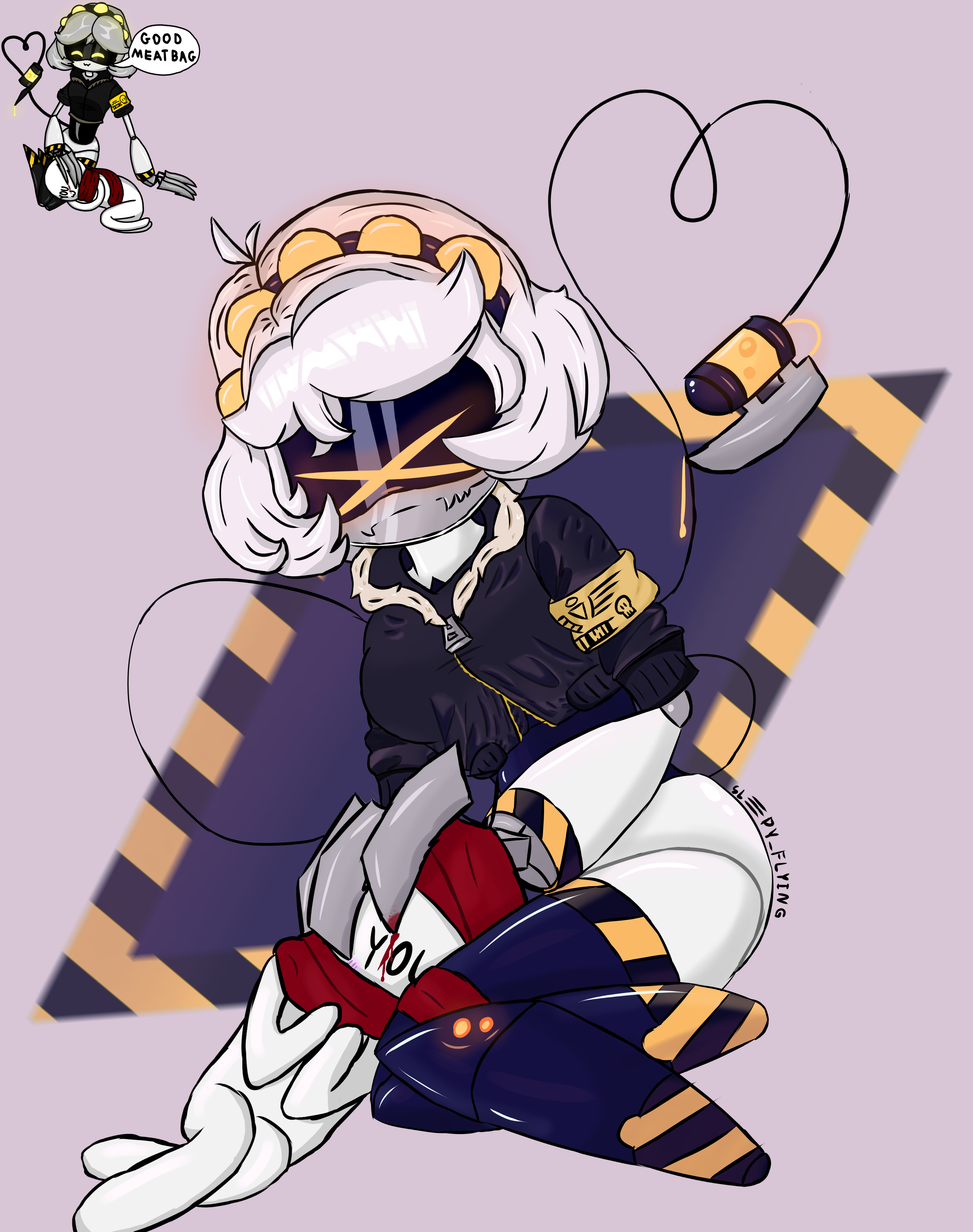 >It was warm in her bed. >So warm, so cozy and safe. >Tessa never wanted to leave. >Suddenly her eyes snapped open, she was in her bed, in her spaceship. >How? The last thing she remembered was that her broken and battered body was in the bottom of an abandoned lab. >Despite her blurry vision and disoriented state, she noticed that her injures were all tended to. >Her leg was in a cast, same with her arm. And her cuts were covered in bandages and bandaids. >Looking around her room, she saw that she wasn't alone. >A tall lanky looking figure was digging through her medicine cabinets, pills, ointments were messily placed on the table. >While two smaller figures were sorting the other things her room, turning her well organized space into disarray. >When she realized they were drones, Tessa's blood went ice cold. >She was injured and was at the mercy of Disassembly Drones who were in her home >And they don't have mercy. >When the lanky one noticed she was awake, it approached her holding a pill and a glass of water. >Tessa whimpered, and tried to push herself farther into the bed. >The figure stopped, and seemly tried to calm her with a soft tone of words that were lost to her. >It gently put the pill into her mouth, followed by the water. >She had no choice but to swallow the pill. >With eyes feeling heavy, Tessa felt herself grow tired each passing second. >But right before she fell under, she saw the drone approach her again. > This time it looked like it had a steaming bowl of soup?