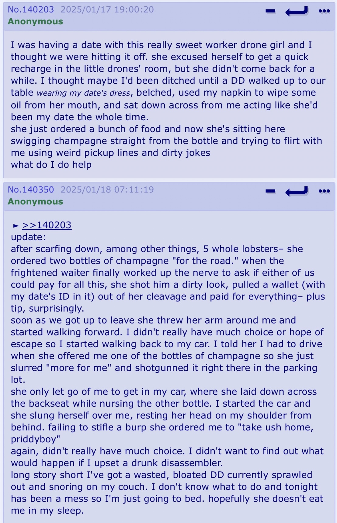 >>162036 If I can ask, why? Friend. >>162037 I'm doing quite well Friend, thanks! Maybe because of its looks? >>162043 He's very silly, a very silly Drone, Friend. >>162051 I had a mini aneurysm, it was around noon yes. Interesting, I guess reading so much in that format tends to make you like it. Yeah, I understand, all the time I have read on AO3 it is because it was linked here first, Friend.