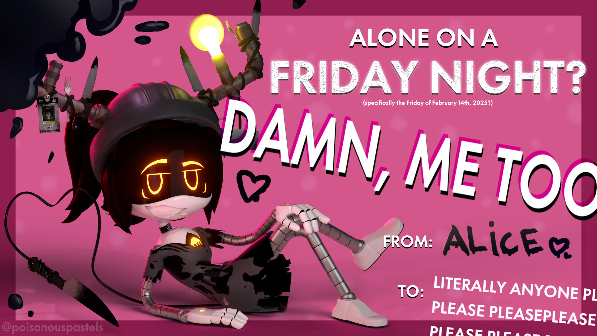 >AM is helping N sort the library >Again >AM feels a tapping on his back >"Best friend AM!" It's Cyn >AM turns around to see Cyn hunched over as usual, however instead of adjusting or holding her head up with her hands she's holding something behind her back >AM looks her in her white optics "What are you hiding?" >"I made this for you Best Friend AM!" >She takes what she was hiding and gives it to AM >It's a red paper heart, withe the word Valentine scribbled on it >AM gbetly takes hold of it and flips it over >On the other side is a crude drawing of himself and Cyn holding hands with the words "BEST FRIENDS!!" written above it >And it's somehow better looking than what N draws >A smile comes to AMs face as he gives the hunched over form of Cyn a hug "Thank you Cyn." >Cyn hugs back >"You're welcome [Best Friend]" >When the hug ends Cyns optics have turned yellow
