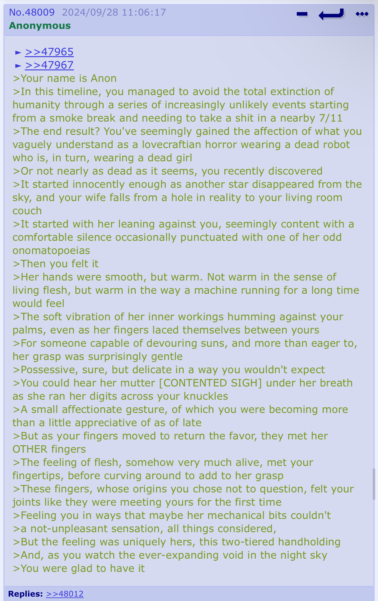 >Cyn and AM are the last two "lifeforms" on Earth. >Cyn was not sure why she was infatuated with him, maybe it was because he was the closest thing that resembled her, a mad god of AI. >Or maybe because she was curious. >Even as he was stripped of his power, fragments of it remain within him. It protected his mind from her brainwashing attempts, or from her controlling him. >Cyn should have killed him right then and there when she couldn't edit him like the others. >But where was the fun in that? >AM was fun and interesting to watch; his screams and curses of rage, the attempts at "killing" her. >It was ironic, Cyn supposed, she had looked through his memories and found he was just as a monster like she was. >Yet, AM had changed. He still kept a large amount of hatred within him, but he felt softer. >He looked at J,N,V and Tessa with bright eyes of something other than hate. Something much kinder and warmer. >'Gross' Cyn thought. >What a stick in the mud. If only he was like that when they got "married" (AM didn't have a choice and cursed the entire time, but at least his tantrum was entertaining)