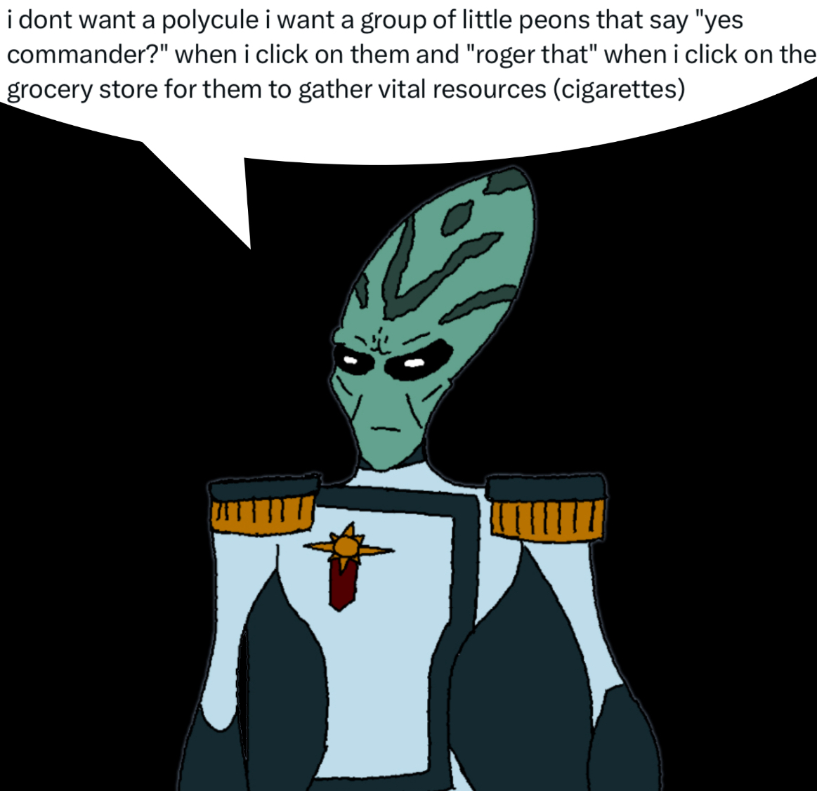 >>172979 Not based in anything really but I like to think part of the reason Jane pretends to be a drone is because after the War theres no one Jane would rather not be then Jane, and pretending to be a drone further alienates herself from herself. That and heavy amounts of alcohol.
