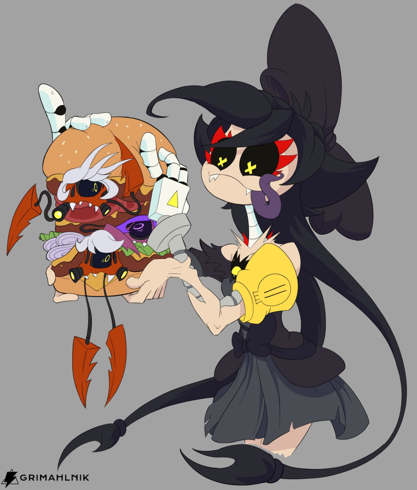 >It was a normal night, you were browsing the internet watching people play a video game in the internet and scream loudly. >you laugh as markiplier falls into a pit and yells about killing the developers. >but then, you hear a voice. >"greetings, friend..." >you turn around >the solver of the absolute fabric, in all her nightmarish glory. >"im very veeery bored, lets do something fun for the night." she says in that monotone robotic voice >you groan in annoyance, "cyn, no. i want to be by myself for tonight," >"rolls eyes." Cyn says she rolls her eyes "cmon my friend, you don't want next sunday to happen again? dont you" she asks, her head tilting all the way around like a pinwheel >You lower your head in both irritation and worry, next sunday was a very painful experience. >"ok....Uhhh.....Cyn, can we go to Burger King? And get a barbecue bacon burger?" >Cyn stops for a moment, tilting her head curiously with a wide smile. A moment of silence passes. Suddenly, she bursts into laughter, giggling with amusement >"You want to go to... Burger King? To eat a..." she pauses, chuckling "...a barbecue bacon Burger?" >"Yes, you like burgers right? Can you eat nonhuman burgers?" >Cyn's laughter dies down to a chuckle, and she responds in a more nonchalant manner "Oh, of course, I can eat non-human food." >she answers while staring directly at you with those x shaped pupils. >"But sure, I'd like a burger. Especially something as delicious as a barbecue bacon burger, hehehe." >“Alright fine, take me there.” >Cyn chuckles and nods in a sinister manner, her multiple appendages clacking together as she moves towards you. Then, her tendrils wrap themselves around you, tightly gripping you. >The world around you starts to blur and distort, shapes and colors twisting and blending together as Cyn transports you both to Burger King >as the world becomes clear again. you find yourself standing inside the restaurant with Cyn still gripping you with her tendrils. >Around you, families and people eating in a calm and peaceful atmosphere. They seem to be unaware of the presence of a eldritch horror, Cyn. >Cyn scans the area, seemingly observing the customers with her cold yellow eyes >"Now, to order my burger."