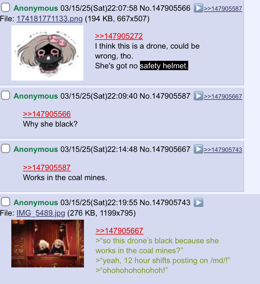 >Fun Early Morning Forgotten OC Facts: One of Beretta's friends in school was a Drone version of Femanon, she only appeared in atleast 3 greentexts before the idea was forgotten/scrapped entirely by the threads