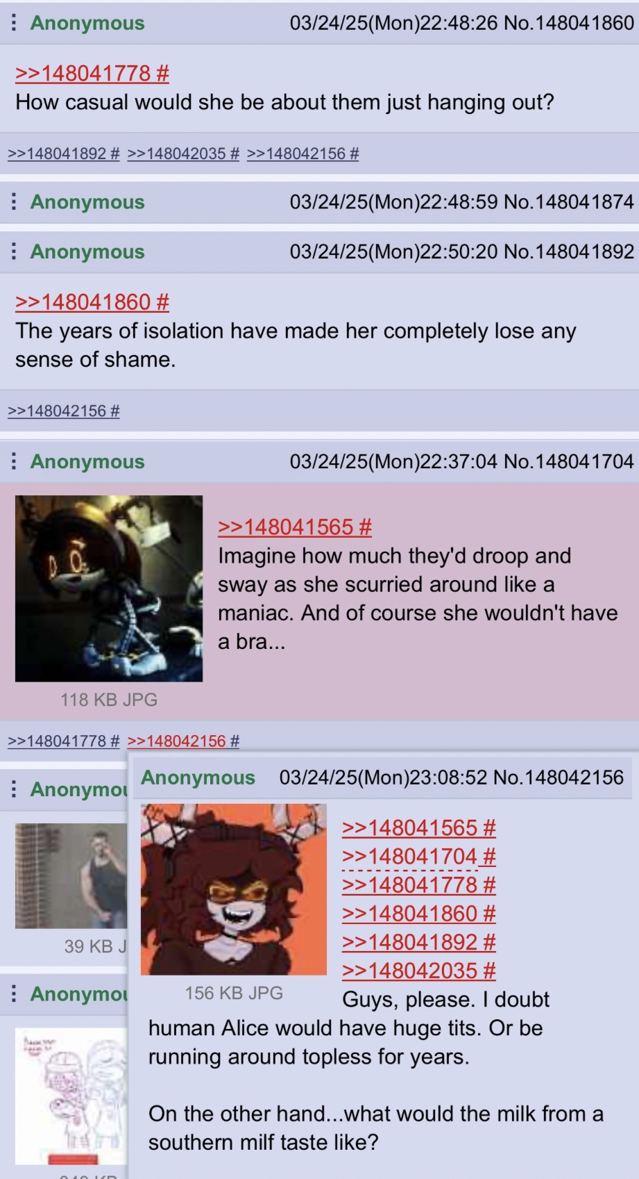 >>184869 >Sorry I'm late I was doing stuff 😎😏 First I wanna say Alice is best as she is in canon, booblet or not, WD chest doesn't work with those and has already a very sexy onmodel shape, a certain attractive fullness and sorta perkiness that is a bit hard to explain but comitts Neuron activation with this 'cleavage' of hers and collarbones above. But if they had there are imo two reasonable takes on Alice. Either you say she is a bit emaciated due to her living situation and she may be on the sleeker side because of that, so anything between large B to small D, it would play into the general appearance similiar to the one human Alice with the deerskull we recently got. On the other hand tho she has a fitting voice and is very hickish/countryish, which along with her general high competence and capability of raising a child in her surroundings (which is extremely attractive imo, who would not want to have that?) makes a very fertile impression. Also don't forget her being older than Uzi&co, she maybe the oldest drone in present along with Khan and the Teacher (DDs aside), but see how fast she still is? What she got from age is only good stuff like experience and voice, maybe even more expressive 'folds' around the eyes which are soo hot, zero signs of slowing down or larp BS. With this age advantage, being a mother (to a h'omunculus', bite me if she got tits she is human so it counts), her voice and general confident appearance as well as the entire Southern& feral fertile vibe, she could absolutely have a stacked rack. Yeva and Doll are Russian yeah, and Doll may have a sizeable chest (either that or nothing, she also has two working interpretations imo), but if we go with both being fuller then Alice imo would 'win' that, age advantage, countriness physicaly active (Doll too) and a mom. So yeah of the maincast Alice could easily have the biggest, most tootable hick honkers