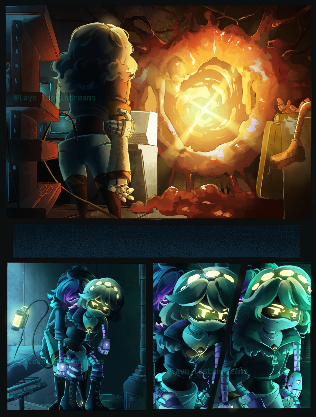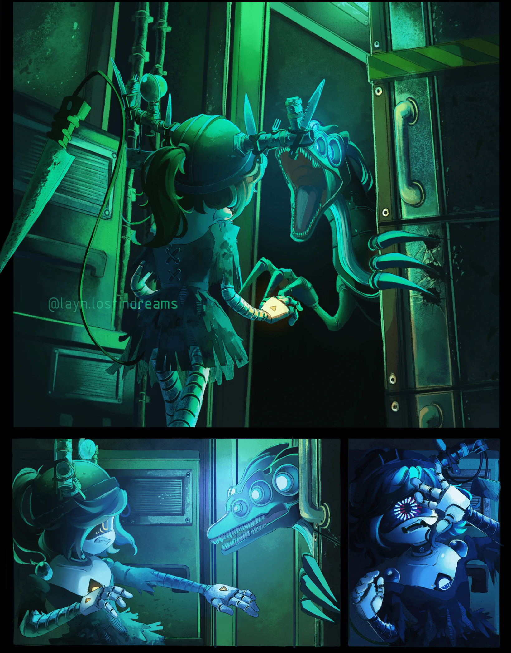 >>186868 I assume it is because Alice here went limp after getting bootlooped instead of literally freezing up like in canon. (In canon she also had her open mouth remain like that, here instead it returned to that sorta pouty look she had when she looked at the Sentinel face-to-face just before getting flashed.) Because of that her legs didn't stay bent and stiff either (which was what made her fall straight back in 6), so in this scene her momentum from that barely initiated attempt at flight didn't make her fall in the Sentinels path but more to the machinery to her left and into 'safety'. This now is only a theory, but there is a chance imo that the sentinel destroying Alice's face was not even intended on its part, and more of a 'kill of opportunity', I think this because it doesn't even look down, but this doesn't matter Anyways, 1st reason imo is that she fell differently here, placing her less in danger. One could think the Sentinel would ofc go out of its way still to destroy Alice anyways, but look at 6's intro for an answer as to why that doesn't need to happen immediately. The bootlooped drone that 029 tried to save was bootlooped for a while already (and we see a few more boolooped ones that aren't destroyed yet on cctv POV during 6's intro) yet still intact, so based on that I'd say that Sentinels first try to eliminate or catch all drones they are aware of before dedicating themselves to destroying them. During the scene with Amda we hear more flashes go off in the background at first, until steps begin to close in of Sentinels that then go to kill the boolooped drones. This isn't proven but I believe they likely work un such a manner. Which is why in this comic Alice gets away without getting her face kicked in, she fell out of the sentinels path (purple) and the Sentinel did see at least one more drone (Uzi) in the room, so it went for those and possible dangers first, ignoring Alice because she is no danger to anyone at this point (the Sentinel couldn't bootloop Beau so it went straight for the kill, they tried the same with V in this room and later again as the elevator left). It seems very believable, I didn't think of using this before in an alt scenario but technically 6 should have gone the same way had Alice not fallen so conveniently in the Sentinels path.