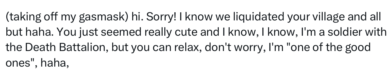 >>186870 >"Bold words for a lucky who only saw the war from a screen of his bloody TV." >"I'd listen to what you have to say about this bastards after a seven-hour defence against an endless ocean of flesh, teeth and claws."