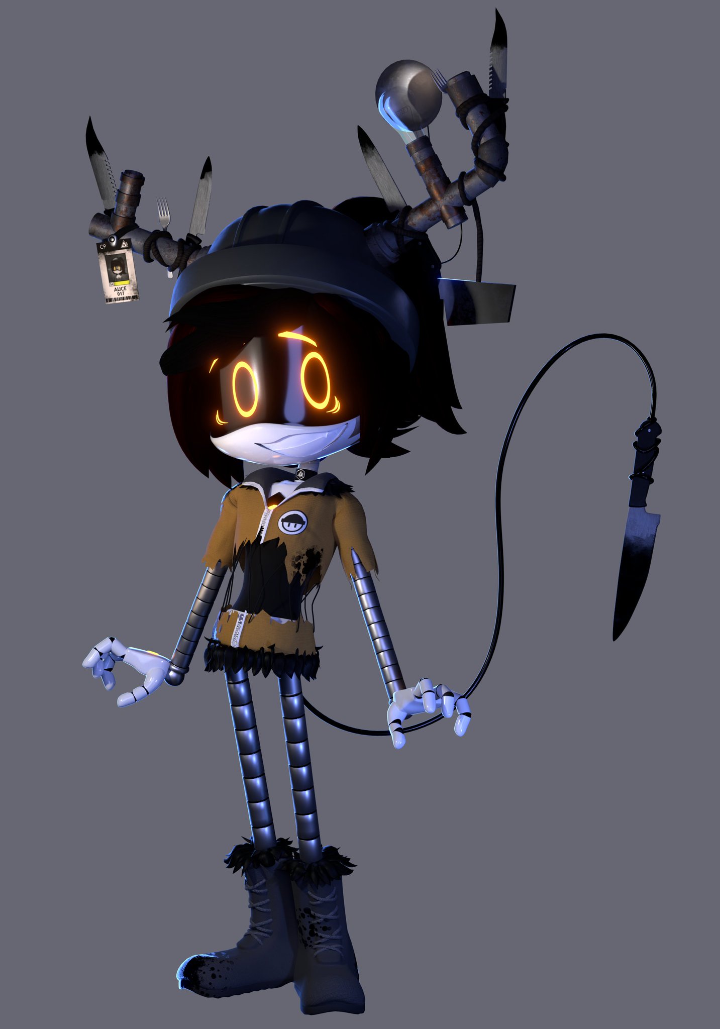 >Officer Molly arrives at the location of a call >A breaking and entering from the sounds of it, and by the look of the front door being ripped off it's hinges it looks like another feral disassembly drone >Molly notices the fact that the house is quiet. Dead quiet. >She shifts her hand to a gun and slowly enters the house >The place is a mess, furniture thrown around, claw marks on the walls and floor >Blood... >Molly freezes as she spots the mangled bodies of a man and a woman in the hallway >She gets pulled out of it when she hears... >Chewing. >Molly slowly and carefully approaches the source of the sound >It's coming from a room, the door cracked open >Molly kicks the door open and aims her gun at the glowing visor of the feral drone >And then freezes up in horror >In the drones hands and maw is the corpse of an infant >And as the drone turns to face Molly, it smiles >It's her >Molly Playhouse, the original one. >"Well GOLLY this is like looking in a mirror!"