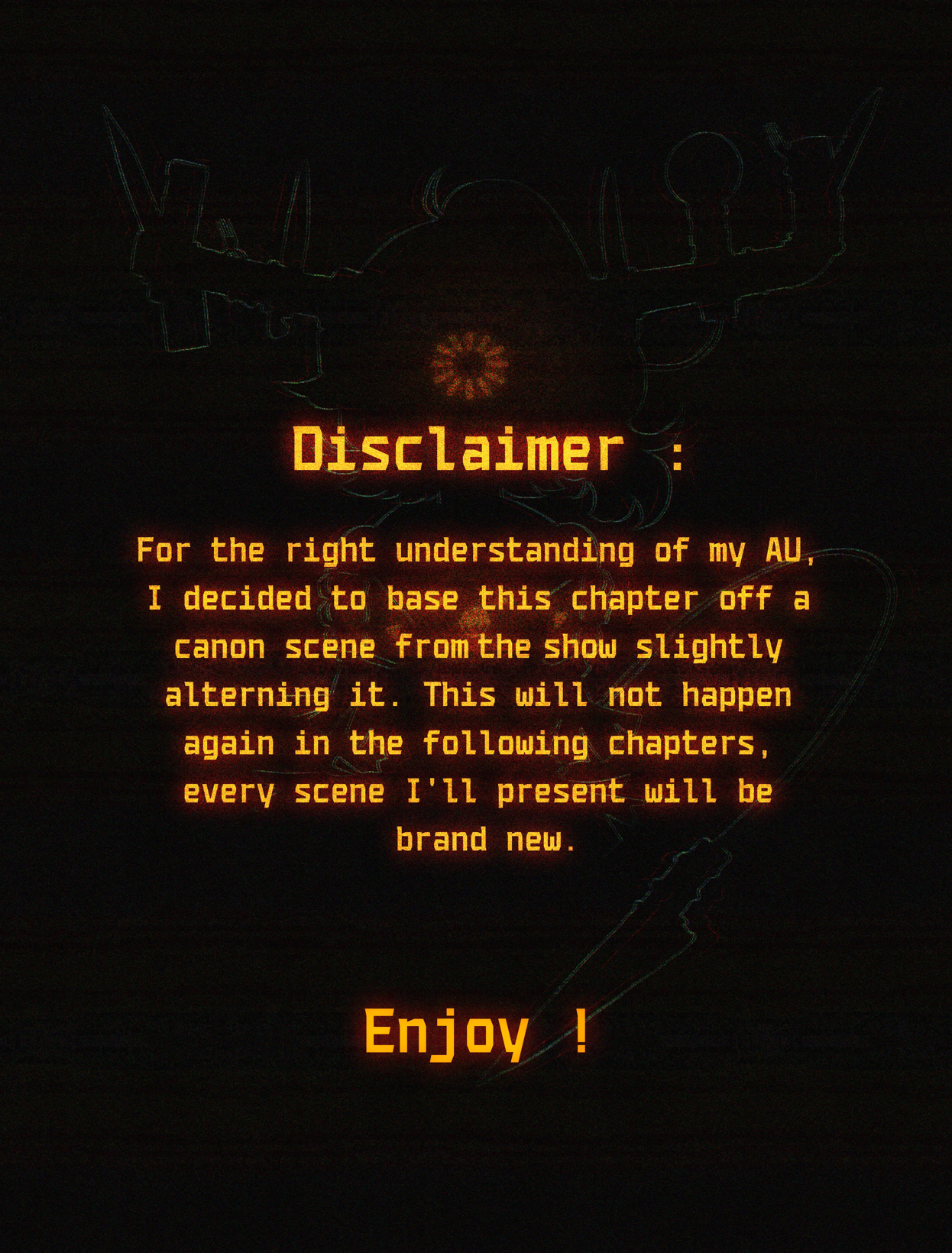 >Tessa lived with her completely normal parents. >She didn't notice how menacing their yellow eyes glowed. (Or the fact it was a non human eye color) >She didn't notice how awkward it was when they walked, how snapping and cracking was heard when they shuffled around the manor. >She didn't notice how she hadn't been outside her room for weeks. (Nor how she hasn't had to eat, drink or use the bathroom) >She didn't notice that through the cracks of her covered windows, the outside was pitch black.