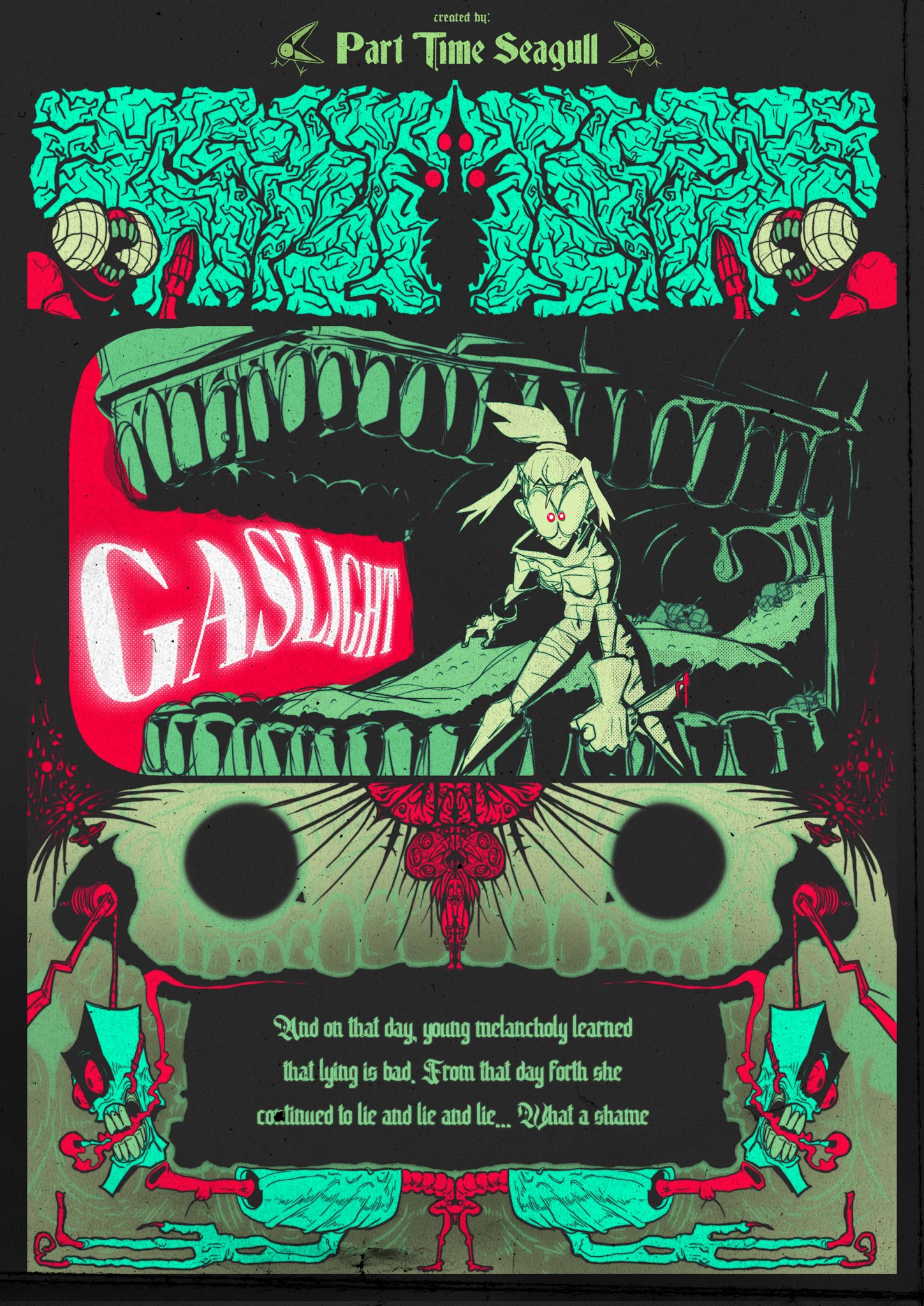 A sudden cackling laughter cuts through the rotting silence. High-pitched. Echoing. Childlike… but not innocent. It bounces from wall to wall, no clear source. Uzi snarls, Solver light flaring. “Show yourself, coward!” she shouts into the darkness. “We are not afraid of ghosts”