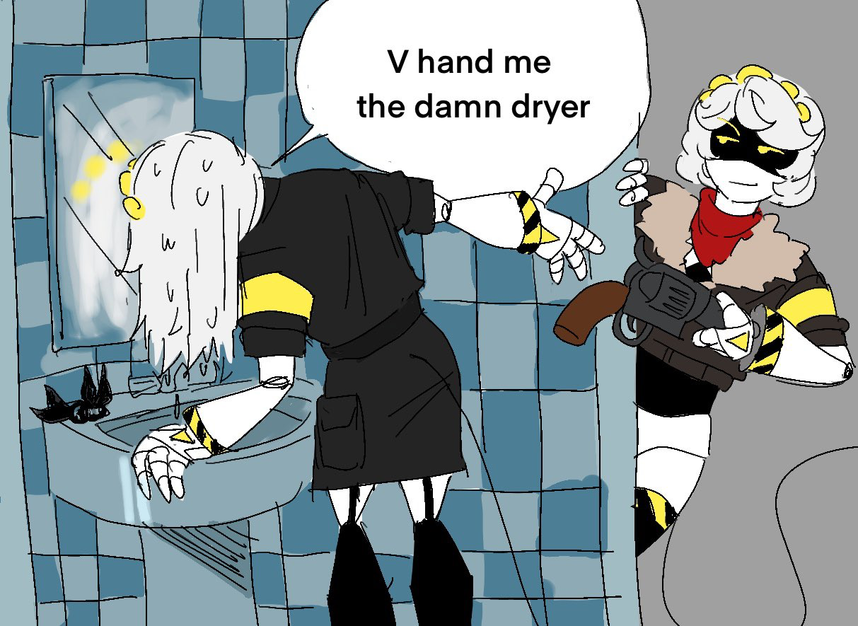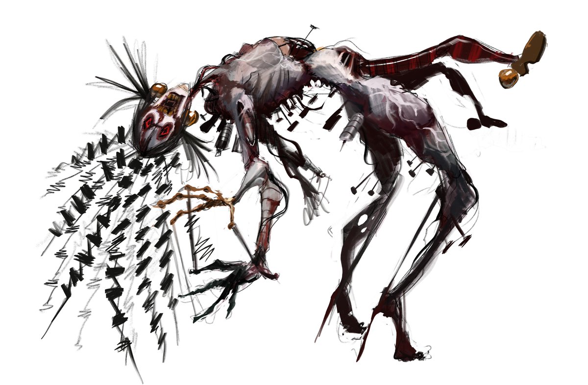 arts too shoddy to properly convey how depraved handler is so i wrote a little green >It happened again. He had killed yet another drone for no particular reason. >Nothing had prompted his aggression, he himself had no idea why he did it. Was it out of anger? Was it an urge, an itch he had to scratch? Was he even conscious while it happened? >Whatever it was, the reasoning behind his actions is of no importance. The fact is that the drone is dead and he is looming over their mangled corpse. >All the onlookers could do is gaze at the crime scene from afar. What little sense those silly worker drones had was enough to keep them away from that unholy creation. >Handler had been standing there, in that spot, for almost half an hour before the colony's favorite not-so-gentle giant, ol Jugg' came around, eager to check up on his little pal. >The big man froze as he was met with a stare more vacant and inexpressive than that of the faceless titan himself. >Juggernaut's eyes, as big, red and circular as ever, now seemed almost sad and droopy. He looked at his friend, unmoving, unsure of what he was waiting for, but waiting nonetheless. >No response, just a slight ripple in the shifting exterior of his kin. Handler is not there. >Not a word was uttered as Juggernaut went up to the three-armed thing, put his arm around his shoulder and walked him out of the room.