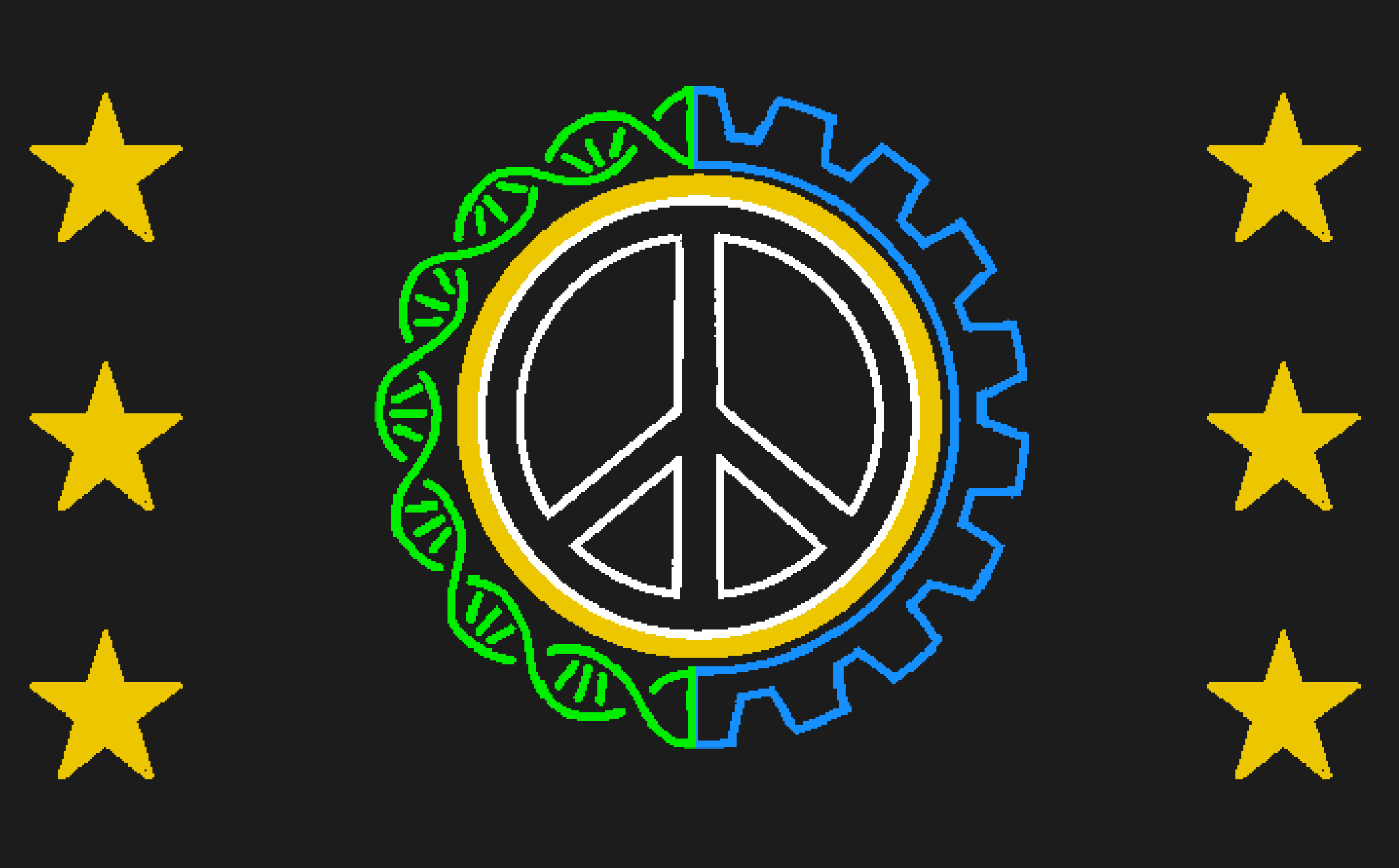 And so was the Resistance born, their emblem being a peace symbol, representing that which they ultimately strived for, wreathed in a ring, half DNA half cogwheel, to represent the Resistance’s regard for all life, both biological and artificial, this symbol is most often seen overlapping a black & white or black & yellow Federation flag, which is a kind of “mourning flag” developed in the midst of the Solver crisis to commemorate all that’s been lost