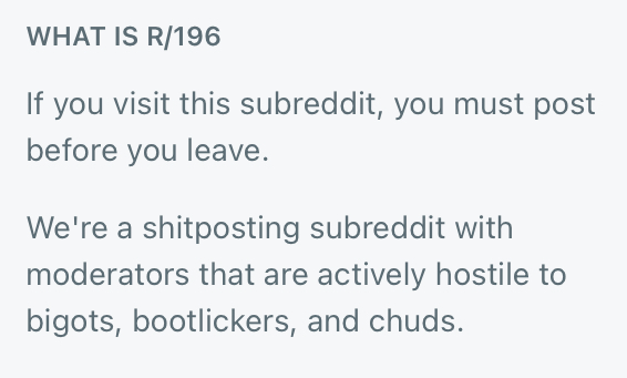 >>196843 >long, long ago there was a great sub called r/195, that had as it' goal to become a completely new kind of funposting sub. >unfortunately it failed and after the owners realized no sub could be popular without being mid, so they closed it >many successors formed >r/196 was also pretty nice for a while, until it became an unfunny trans circlejerk ngl they were fun back then, and also pretty unique, a worthy successor