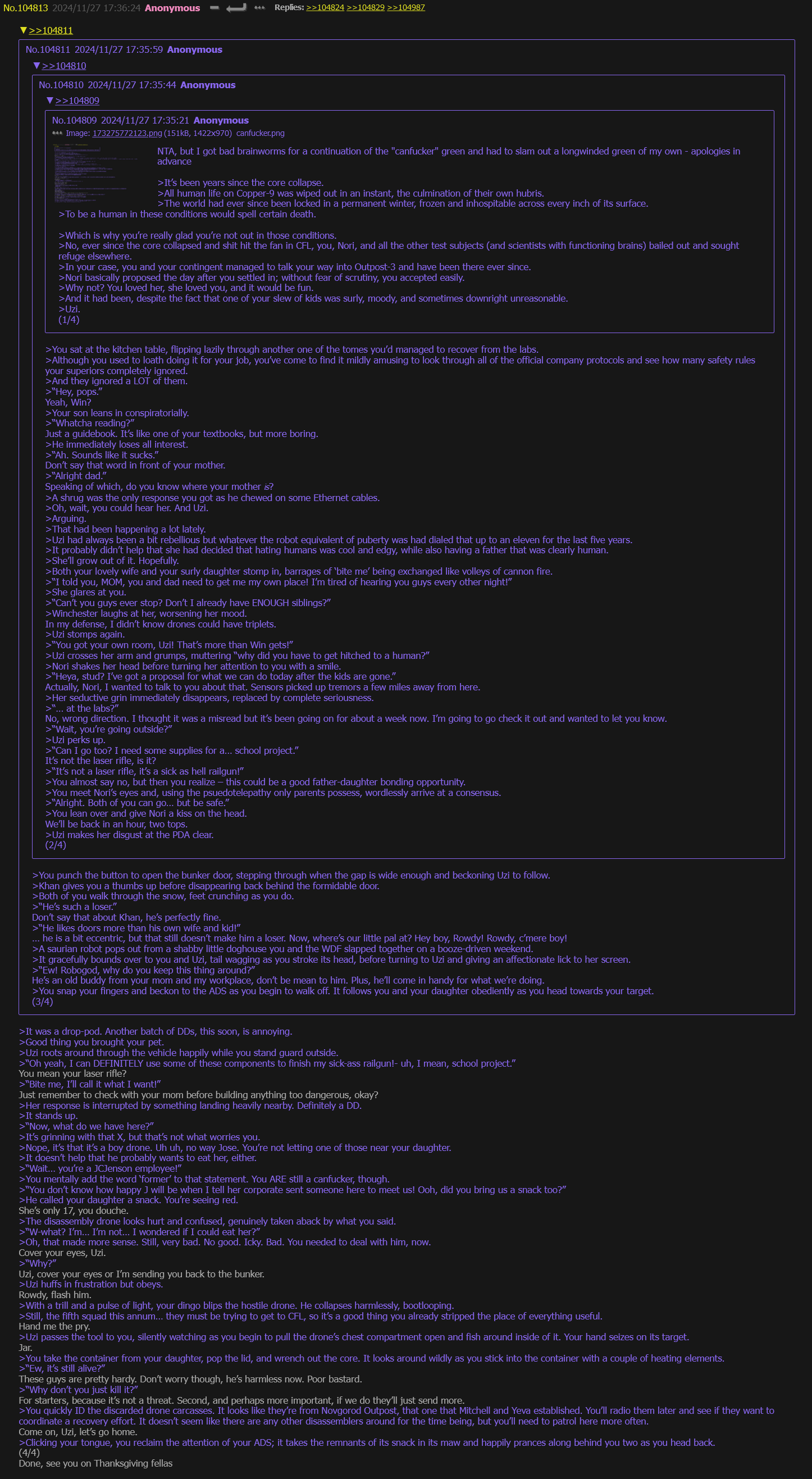 >>205556 Nta But my assumption is that every (or at least a huge portion) of CFL subjects are zombie drones, there are some reasons for why that would be desirable and a few hints as well. As far as I know CFL wanted to find out more about AS as well as patch hosts (like Yeva, only known success), which requires Solverhosts which only zds can become (due to them being vulnerable to AS since their programming is damaged/the failsafe that not only triggers upon 'death' but also AS detection [like we saw on Uzi at the pilot's end, unsure tho why it took so long to try terminate her, didn't work tho since she inherited AS] not working, which would probably kill a normal drone if it has any AS contact), so it would make sense to have only ZDs as subjects, since otherwise, as can be seen there >>205566 you would need to kill 10.000 drones on average until you get a POTENTIAL host (i dunno the numbers for ZD to SD, but overall you would probably need to kill millions of normal drones to get a host), using time and resources they didn't have. It is headcanon but due to that I believe CFL collected ZD cases from all over the planet (searching bodypiles probably) in order to get their iirc ~2-400 subjects, going of numbers only.