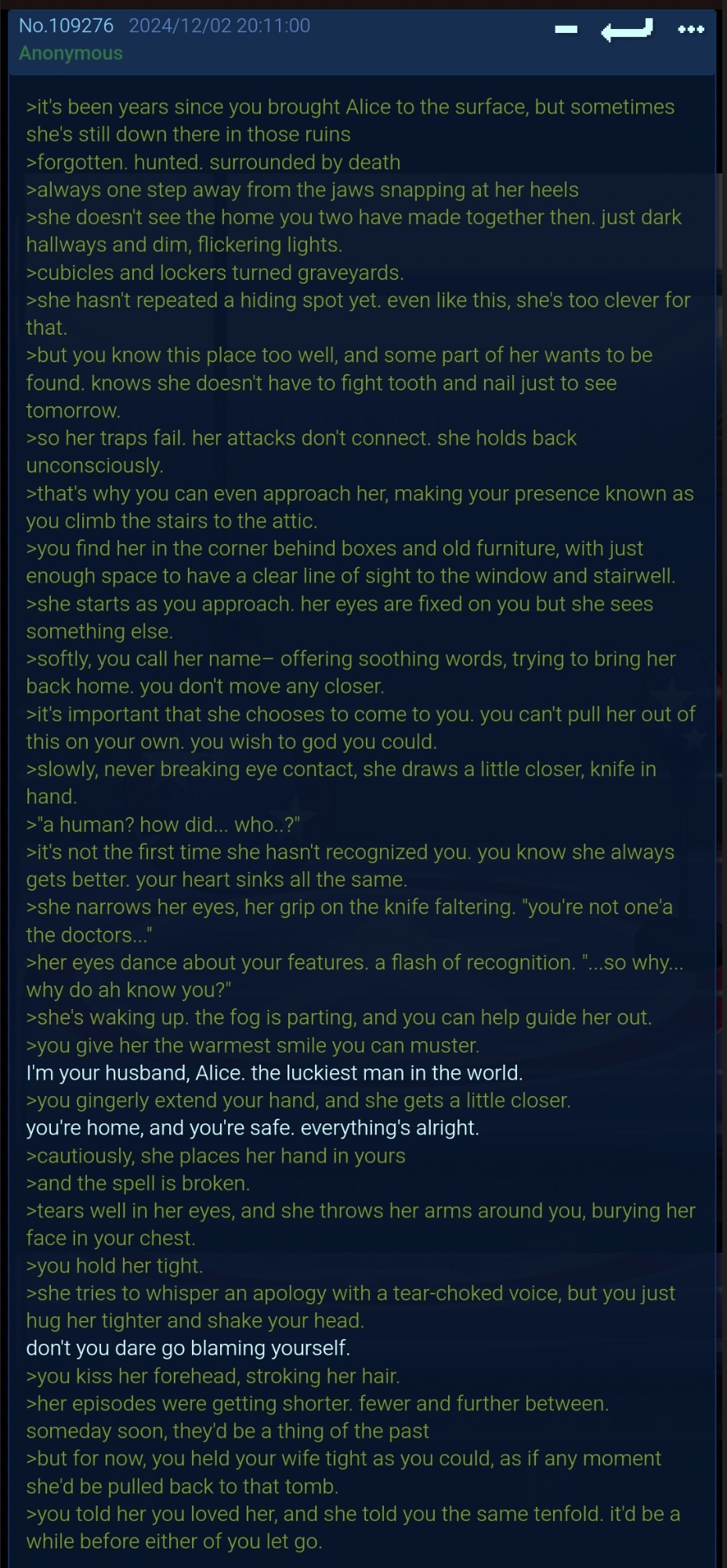>Anon put out his cigarette and went inside the apartment building >Down the stairs, hearing his neighbors talk while walking to his specific apartment >He didn't feel anger anymore, maybe a bit of jealousy, mixed with a lot of sadness >Once again, he put on some music, and started to sing while looking around "Show me how... You care..." >He looks outside the window, to the balcony, his fourth attempt, stopped by them >He was already in the air, basically, before being grabbed and pulled back in >He takes a box from the pastry cabinet, taking out some cookies and eating alone at the table >The feeling of loneliness comforts him, and at the same time, it doesn't feel very good >He doesn't know how to feel about them, the twins, he feels like he's just ruining their life >At the same time, he feels so grateful that they are there >He wonders if their nice nature is forced, or they really care about him >He looks at his wrists, third attempt, they found him in the bath bleeding out, he barely survived >"But then I understand... The friend I'm dreaming is far away..." He liked this song, a bit cheesy, but it was nice >He still couldn't forget about her "But I'm here... I'm here..." >She was the reason for the second attempt, your old ex-girlfriend >Even after all this time, Anon hasn't forgotten about her >She ending things with him hurt his chest a lot, even to this day >The pain of someone so special to you dropping you like you are trash >Hitting the floor is a pain hard to forget >The revolver was thrown out by U-U to stop him from trying again